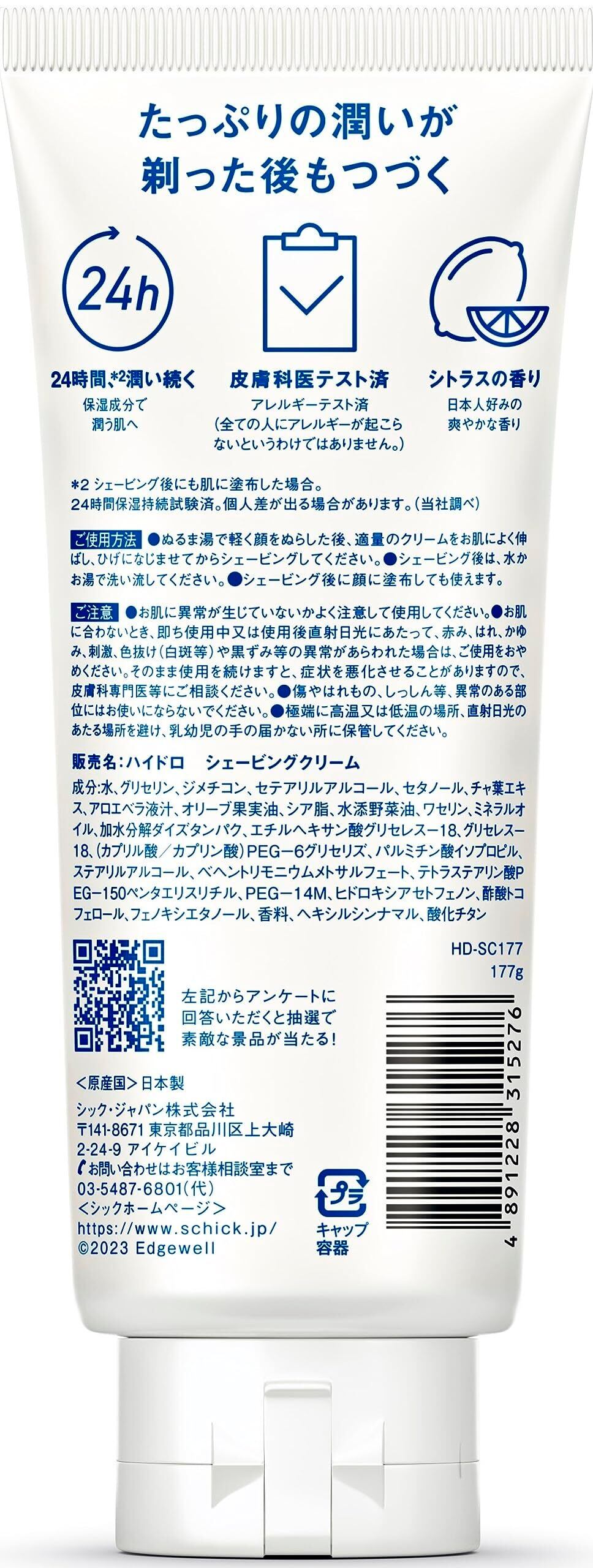 【Shick ハイドロ シェービングクリーム】 Schick ハイドロシリーズから洗った後でも肌に優しく、保湿力の高いシェービングクリームが登場。シトラスの爽やかな香り【24時間潤いつづく】 肌の潤い成分(シアバター・アロエエキス・加水分解大豆たんぱく等)配合によって、24時間*の潤いを実現。*シェービング後にも肌に塗布した場合。24時間保湿持続試験済。個人差が出る場合があります。(当社調べ)【肌に優しい】 皮膚科医テスト済*の低アレルギー性処方を採用することで肌ダメージを軽減し、シェービングに必要な「肌滑り」と「切れ味」を提供。*全ての人にアレルギーが起こらないというわけではありません。【内容量/原産国】 177g/日本 Design, Specification, Appearance and price can change without notice 商品のデザイン、仕様、外観、価格は予告なく変更する場合がありますのでご了承ください。