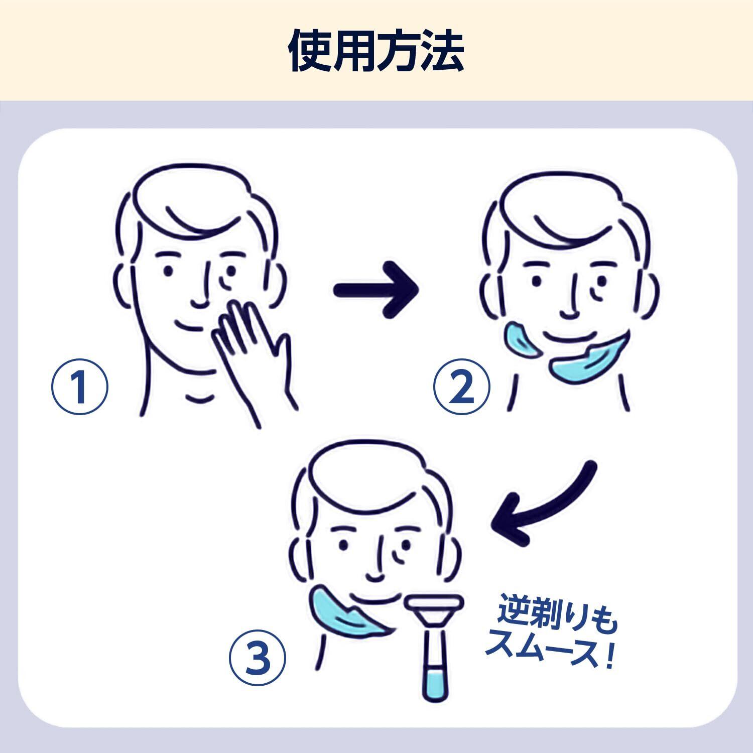 ○適量を手にとり、肌によくのばしてから剃ってください。○つけてしばらくおくとヒゲがより柔らかくなり、剃りやすくなります。○中味が少なくなったときは、キャップを回してはずすと最後までムダなく使えます。○ヒゲ剃り後はかならず洗い流してください。○カミソリは洗面器等にためた水の中で振り洗いすると、早く洗えます。