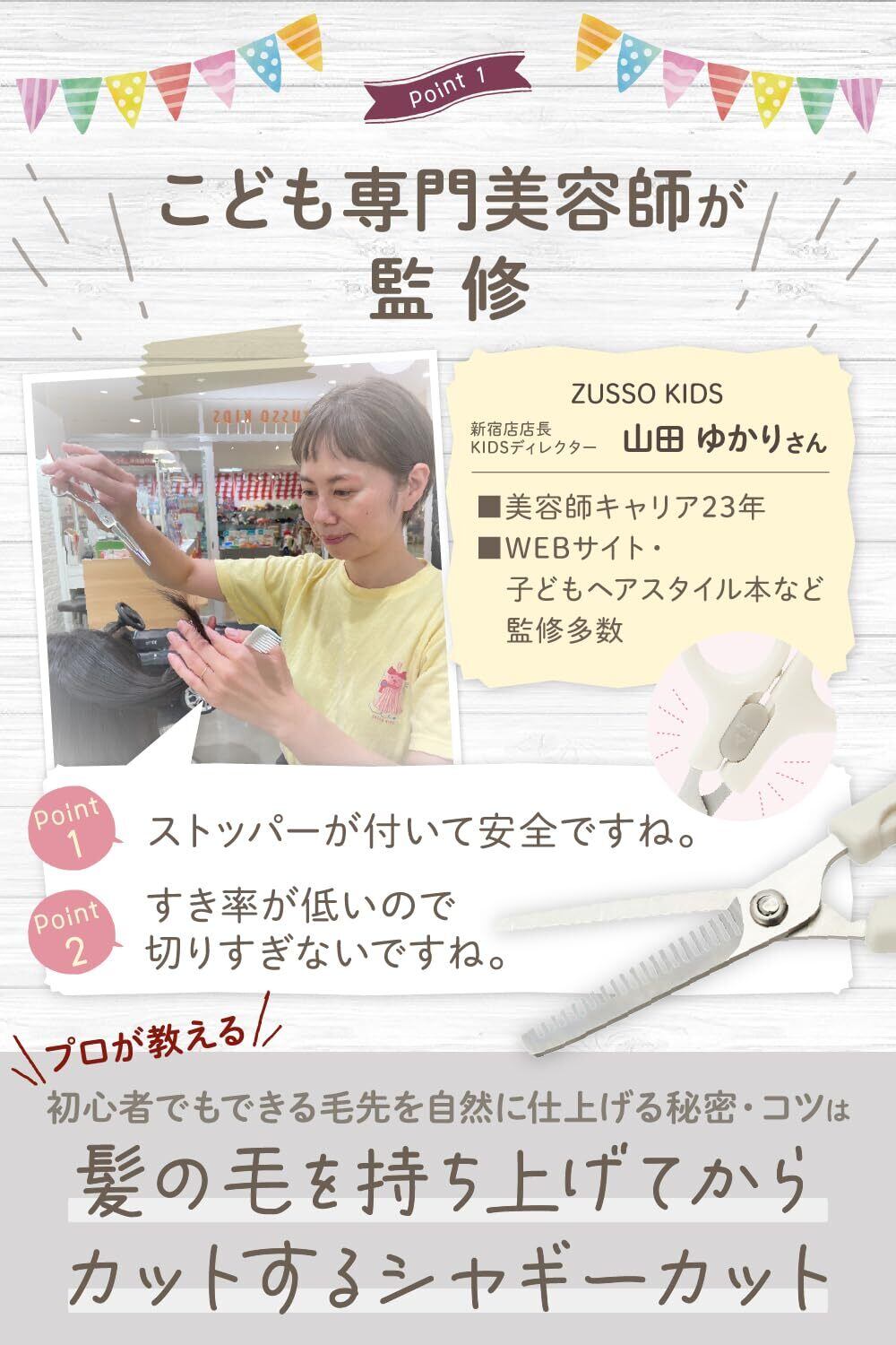 『安全機能②』 刃先をより丸く。1~3歳児は 散髪 時に予期せぬ方向に動きはさみが肌に触れることも稀にあるため、 一般的な ハサミ の先端より丸く 安全 に。そしてママさんが 安心 してカットに集中できるように設計しました。