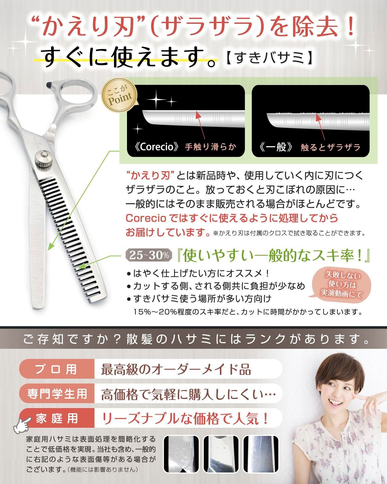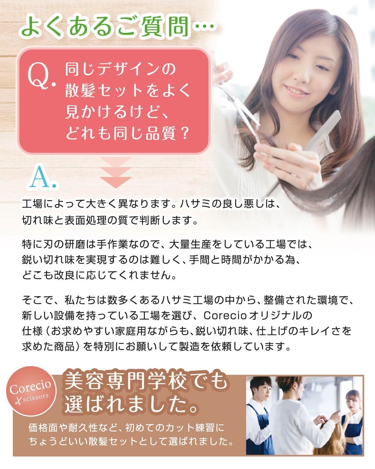 【 美容師 さんと一緒に選びました。】 快適な使い心地のハサミをお客様にお届けするために、サンプル選びの際に実際に美容師さんと 理容師 さんに 前髪 やトップ、サイド、襟足 などのカット、すきバサミ での ボリューム調整 を試していただきました。家庭用 としては十分に使える機能と切れ味のものを商品化しました。