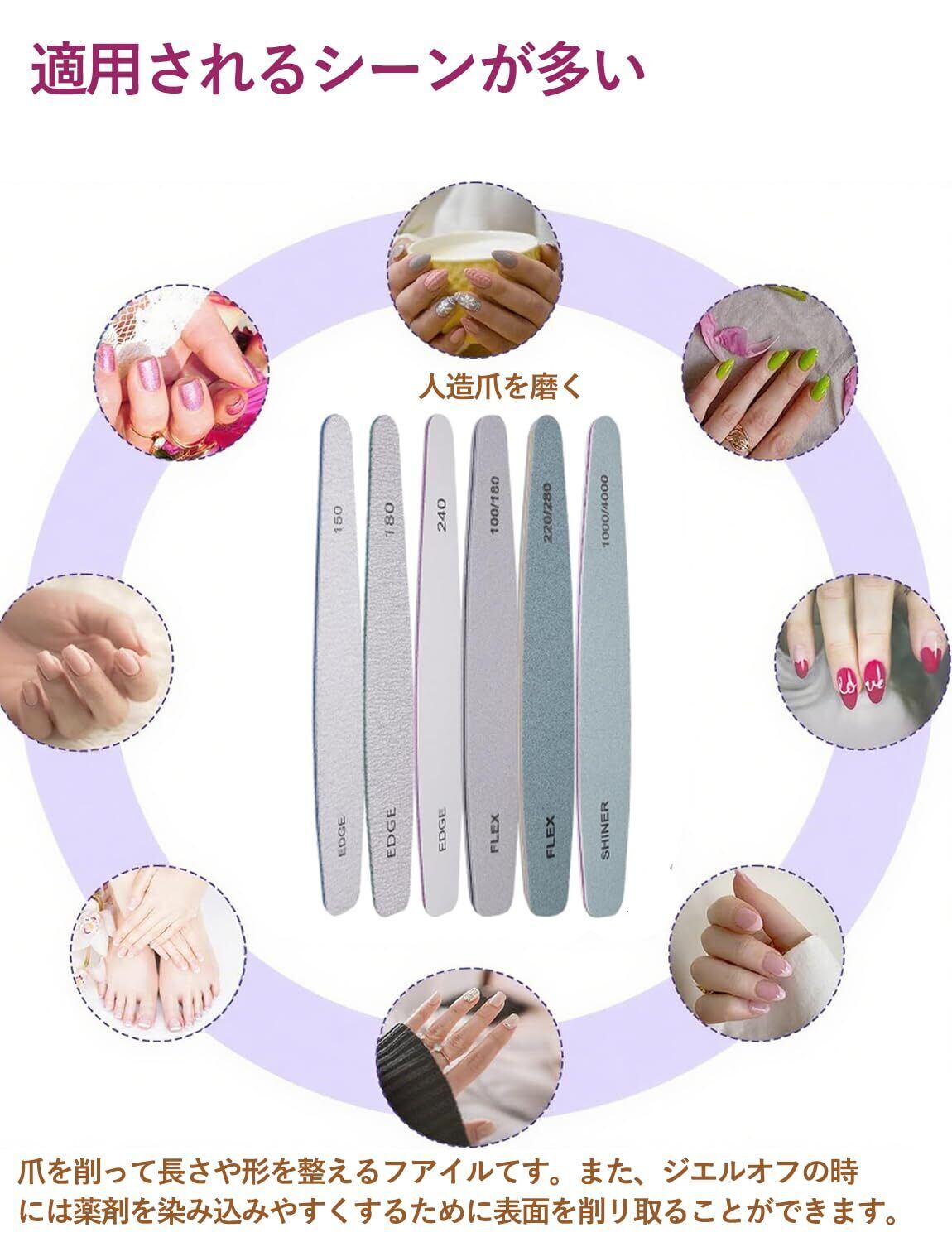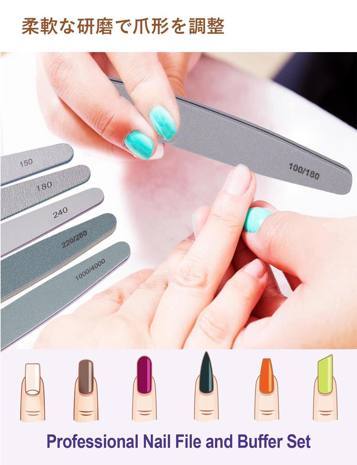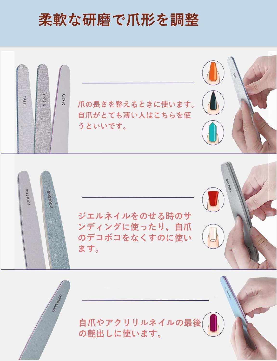 【爪やすり+爪磨き】:セットには150、180、240、100/180、200/280、1000 / 4000グリットがある。ジェルネイル必需品の100/180gは自爪、人工爪表面の凹凸を滑らかに整えますが、1000/4000gはすごく細かいヤスリで、ピカピカにする前の最終段階に使用します。