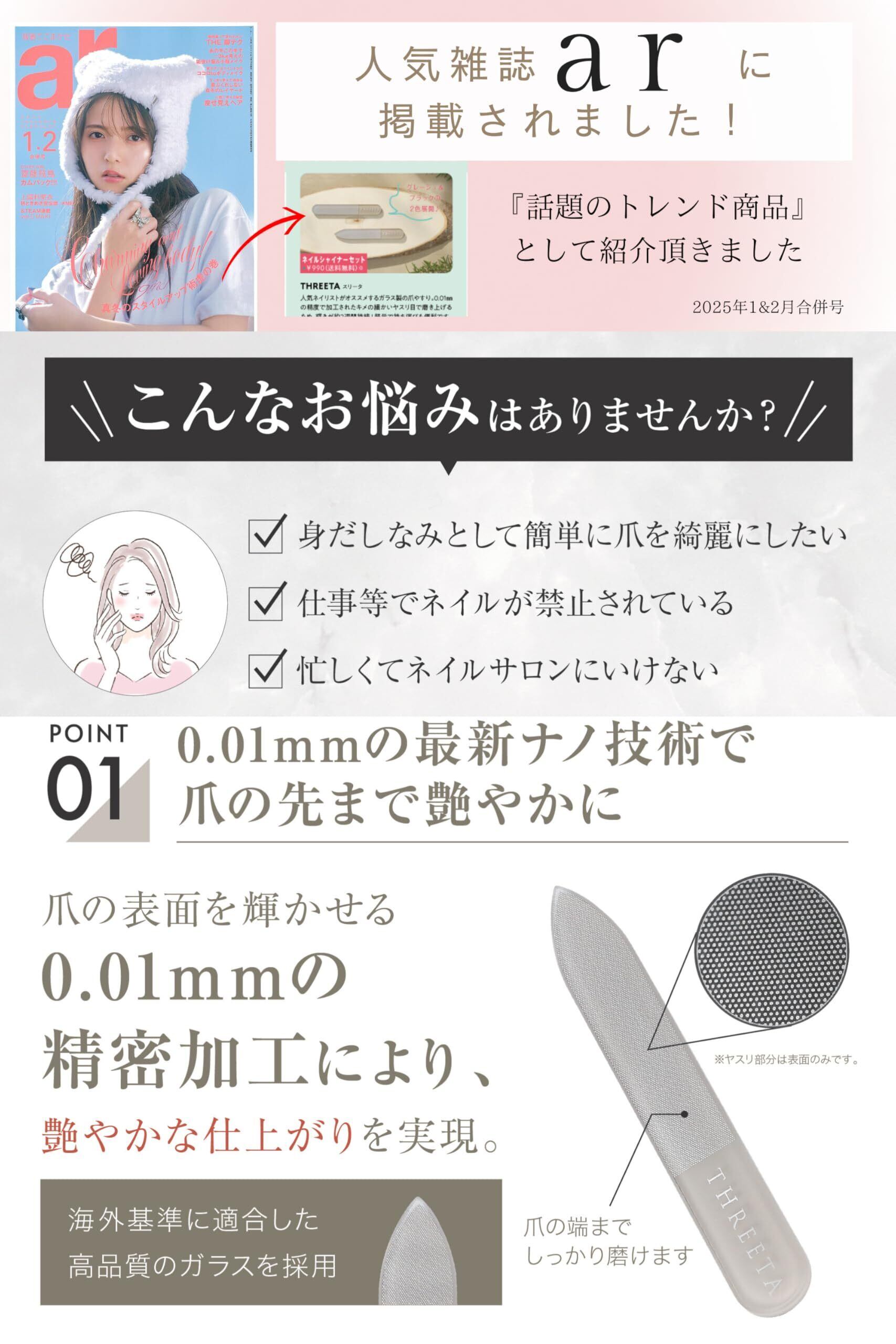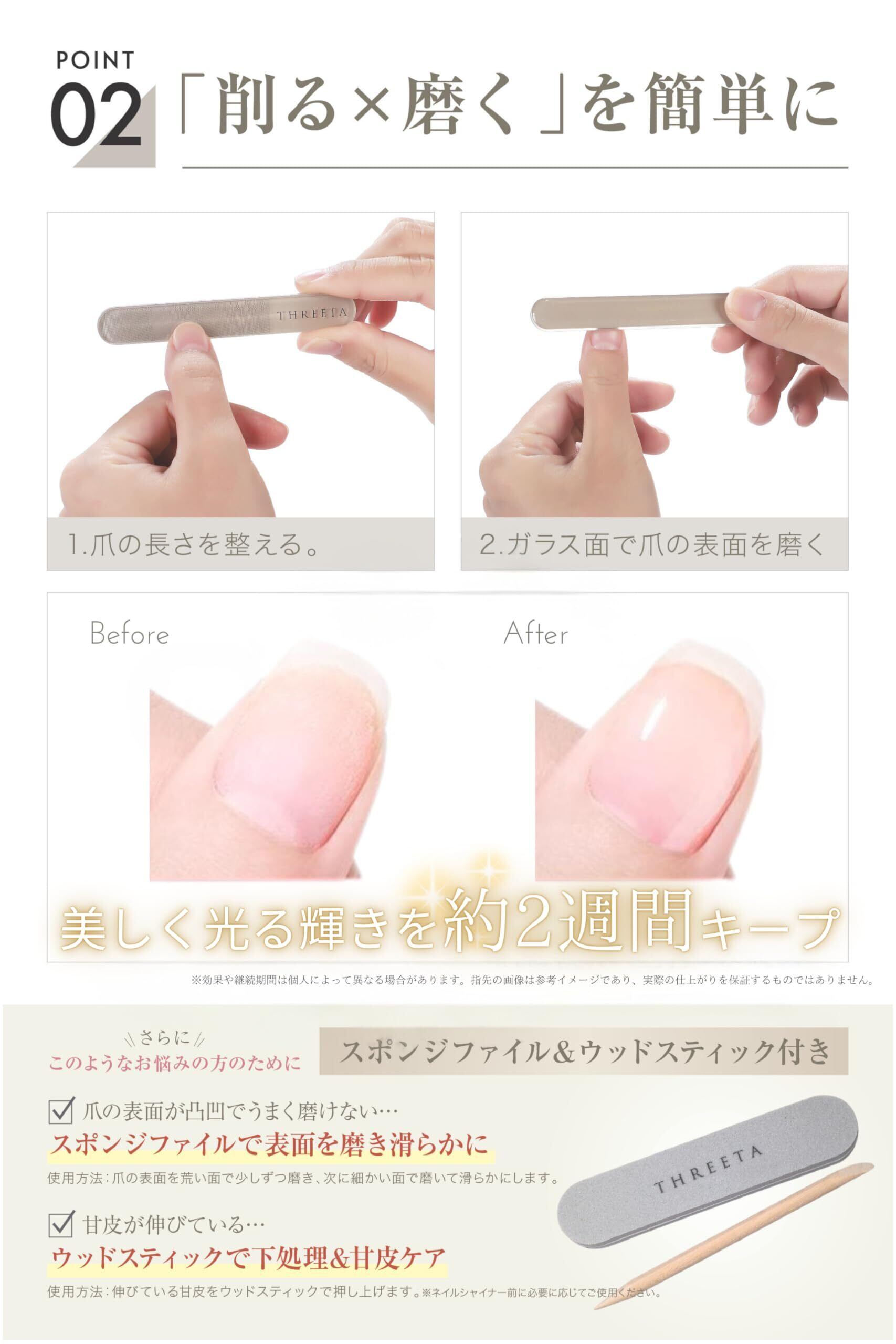 【雑誌掲載商品】 THREETA 爪やすり 【人気ネイリスト監修 スポンジファイル&スティックセット】 爪磨き ガラス製 艶出し ネイル ケア 爪ヤスリ ファイル 子供 男女兼用 (グレージュ2本セット, 2, 本)