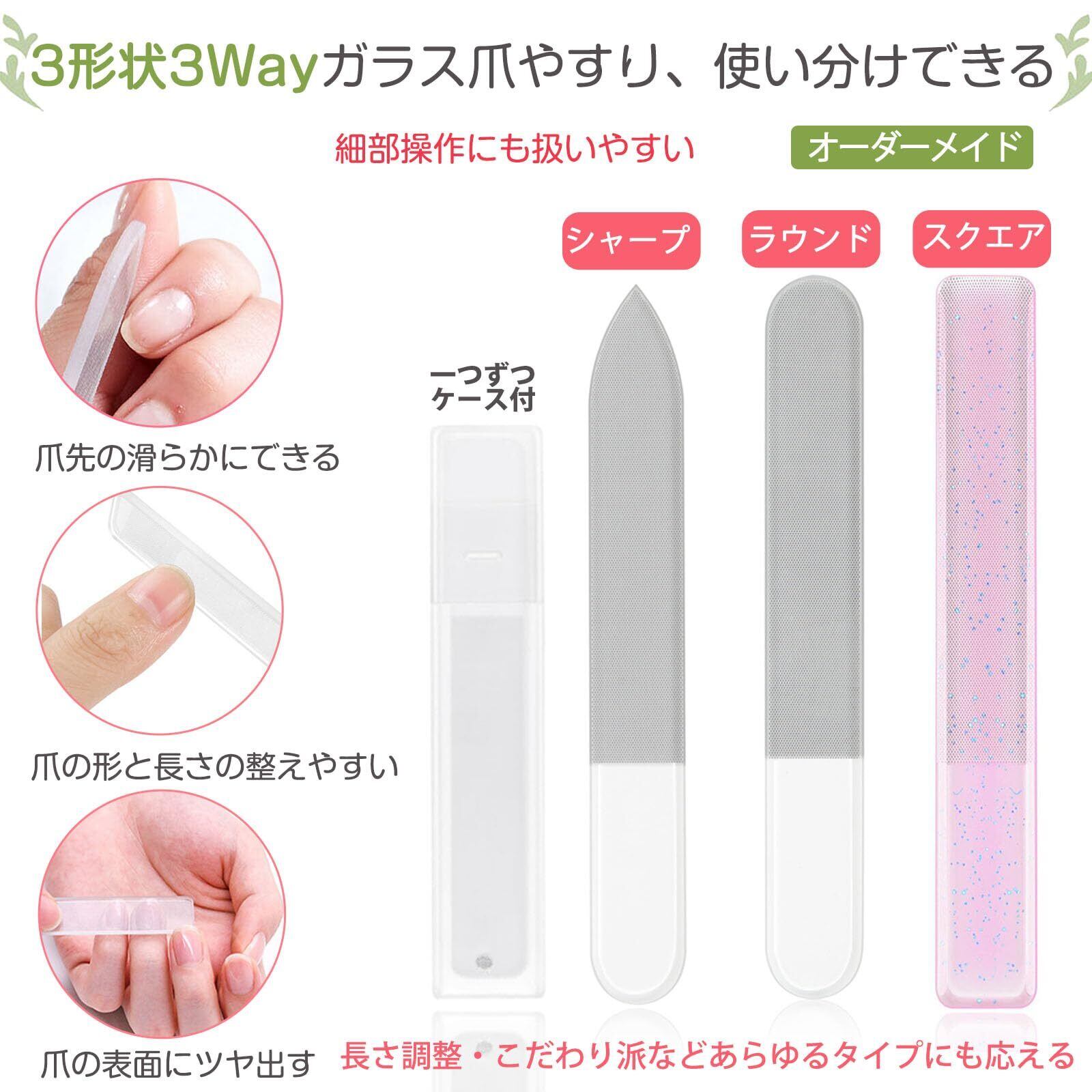 【全てスッキリ!爪先・長さ・形・爪磨き・お悩みを】3類ガラスシャイナー+2本2面スポンジファイルが揃えている。爪の表面の滑らかにすることやピカピカにするのはもちろん、爪を好みの形や長さに整えておしゃれに楽しめる:①「ガラスシャイナー」で形や長さを整える。②「スポンジファイル」の目の粗い面でシワや凸凹をとる。③「スポンジファイル」の目の細かい面でより平らかに磨く。④「ガラスシャイナー」でピカピカに磨いて仕上げる。