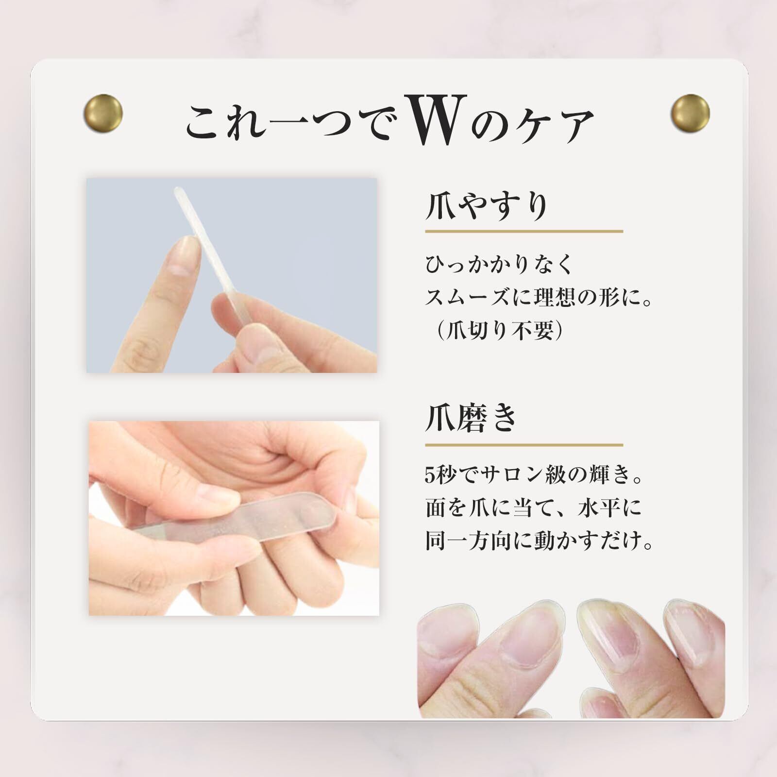 【 爪やすりとしても優秀】サロン級の 艶 出しだけでなく、爪やすりとしても非常に優秀。粒子が細かく皮膚を傷つけないので、赤ちゃんのすぐ伸びてくる爪にも最適。 二枚爪 や 荒れた爪 も簡単に 滑らか 艶々になります。最近では 介護 ケアや、素早く仕上げたい ペット の ケア用品 としても重宝されています。綺麗なパッケージだから、ギフト プレゼント にも人気です