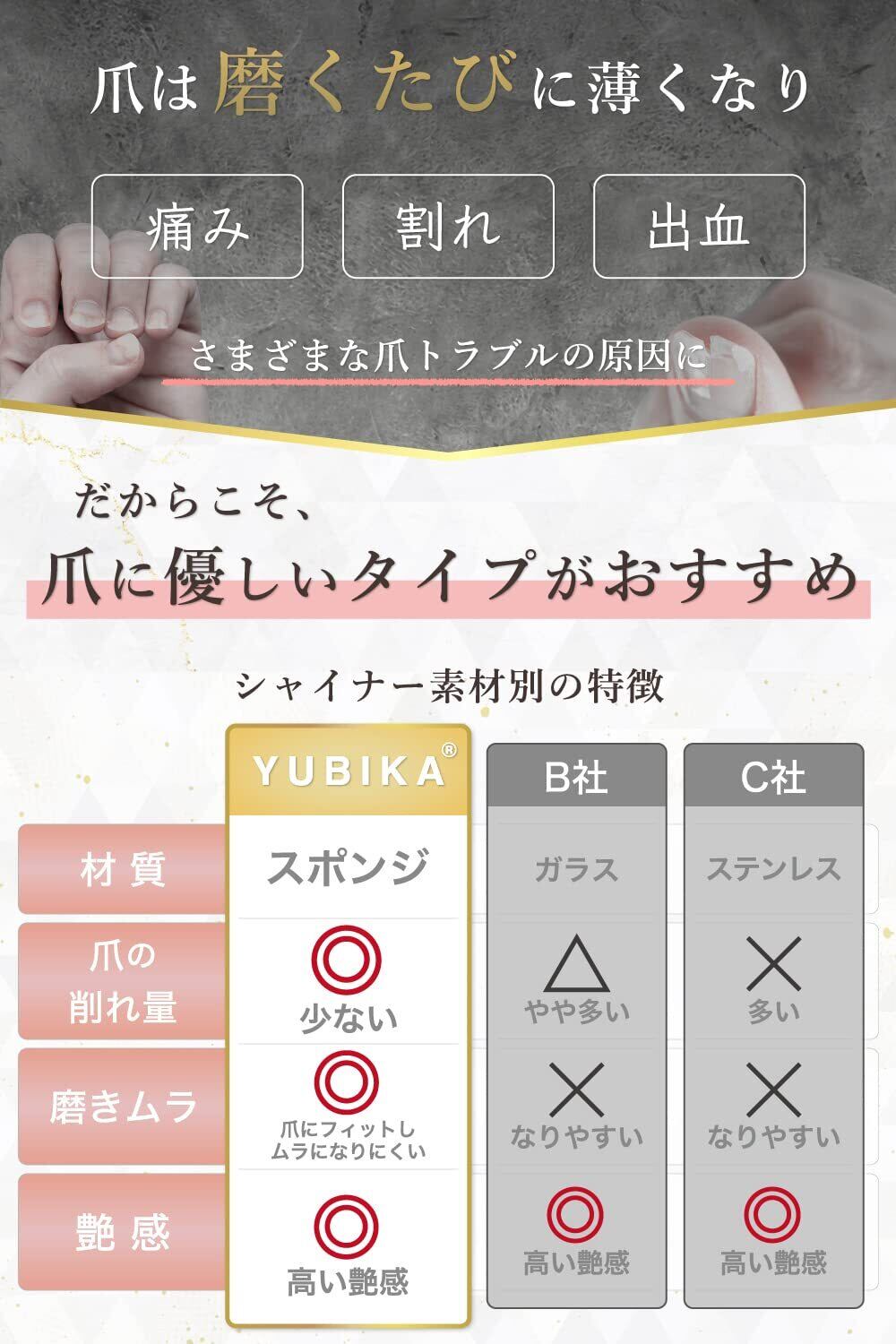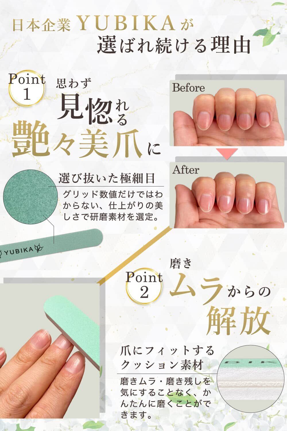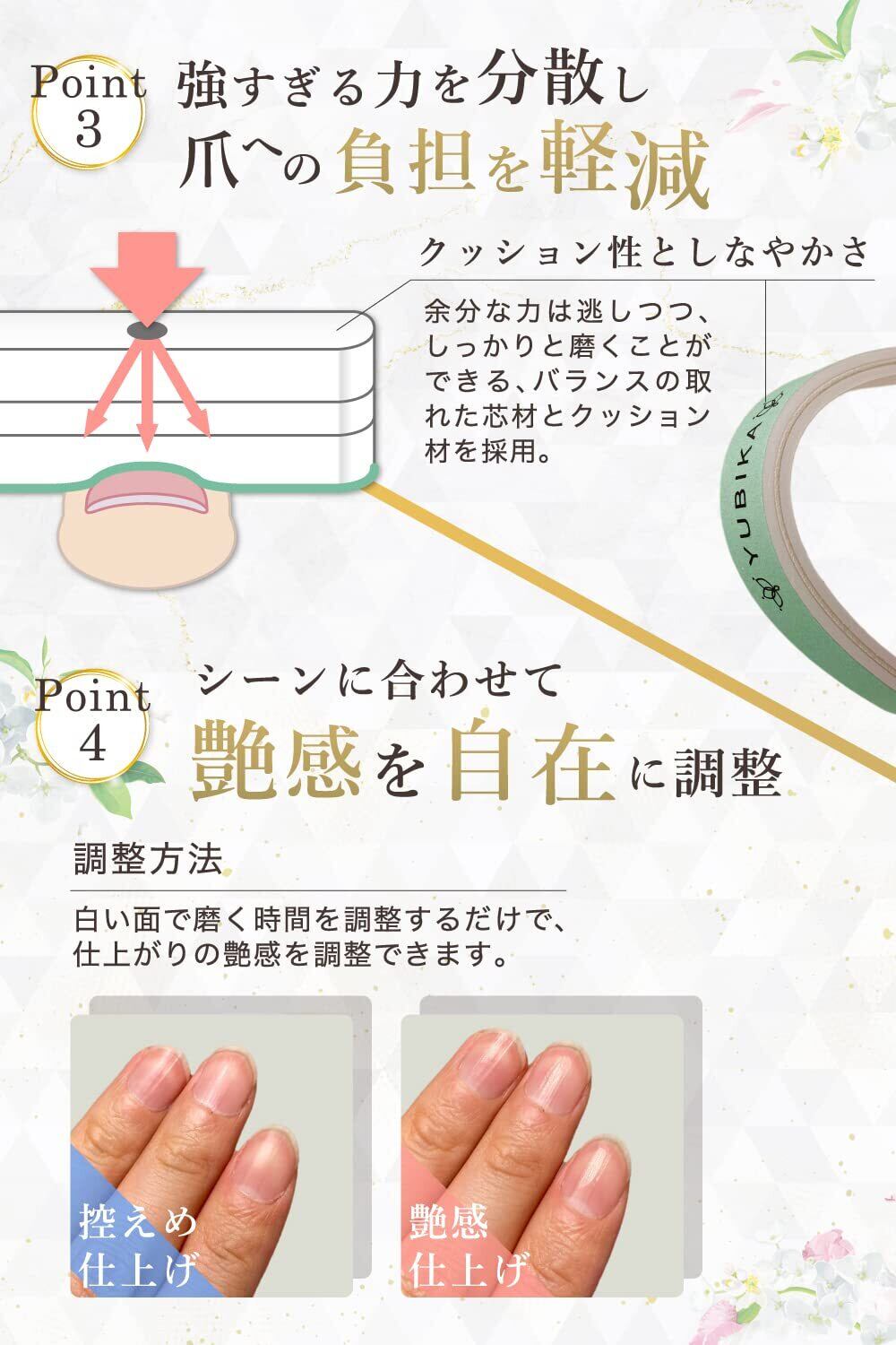 【爪に優しいタイプ】爪磨きによるネイルケアでは、できるだけ爪を削らないことが大切です。極細目のバッファーは過度な力を分散し面で磨くため、爪の削れる量を抑えることができます。