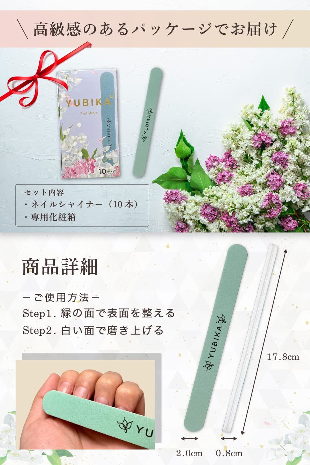 【商品仕様】ネイルシャイナー 10本入(爪表面のつや出し用つめみがき・ネイルファイル)。グリッド数:600 / 3000。シャイナー単体サイズ:長さ17.8cm、幅2.0cm、厚さ0.8cm。素材:EVA樹脂、プラスチックボード(PS)。