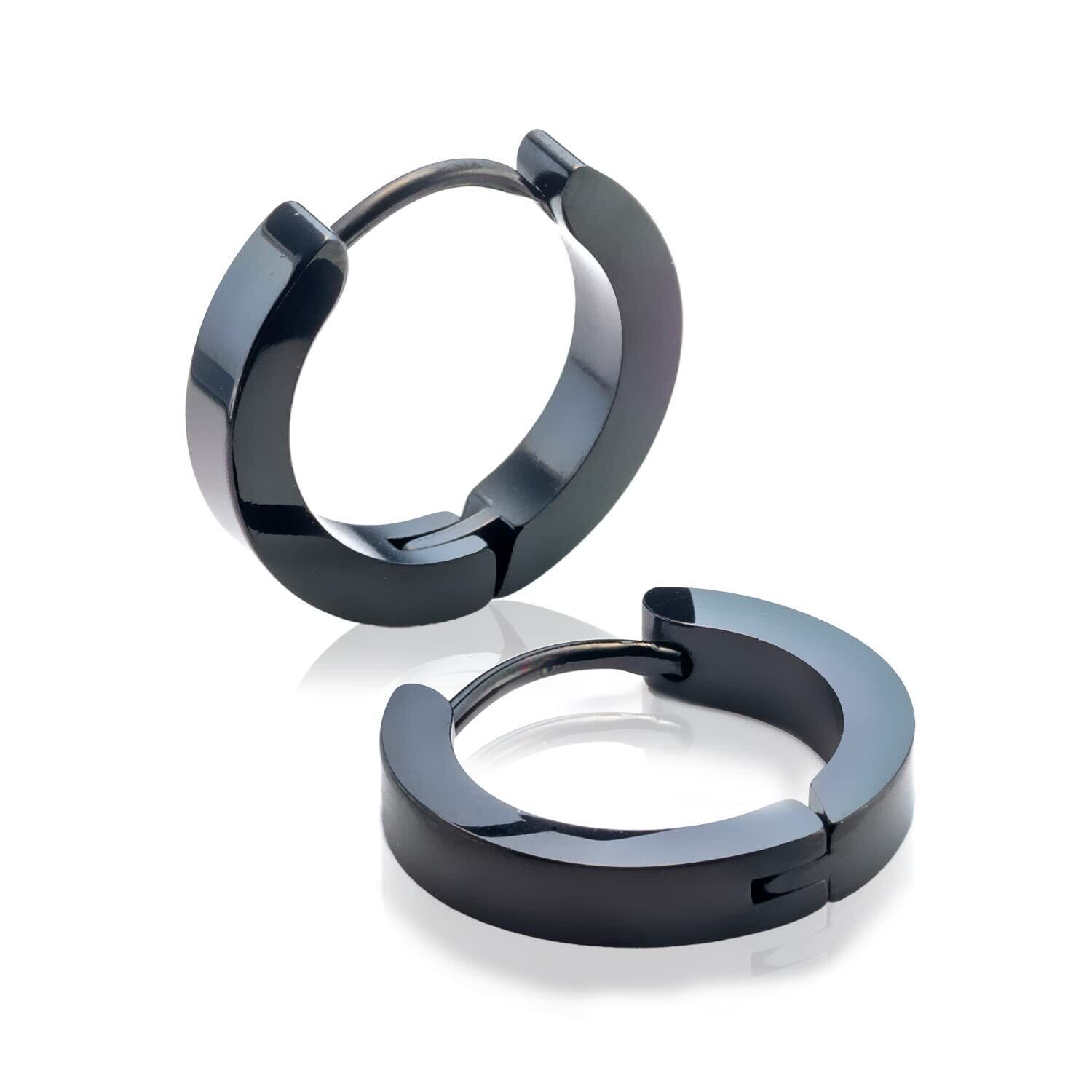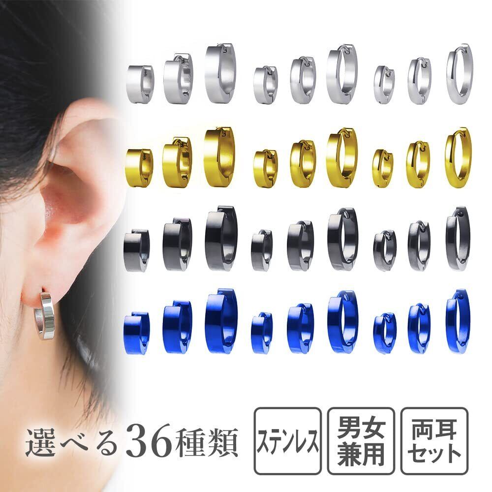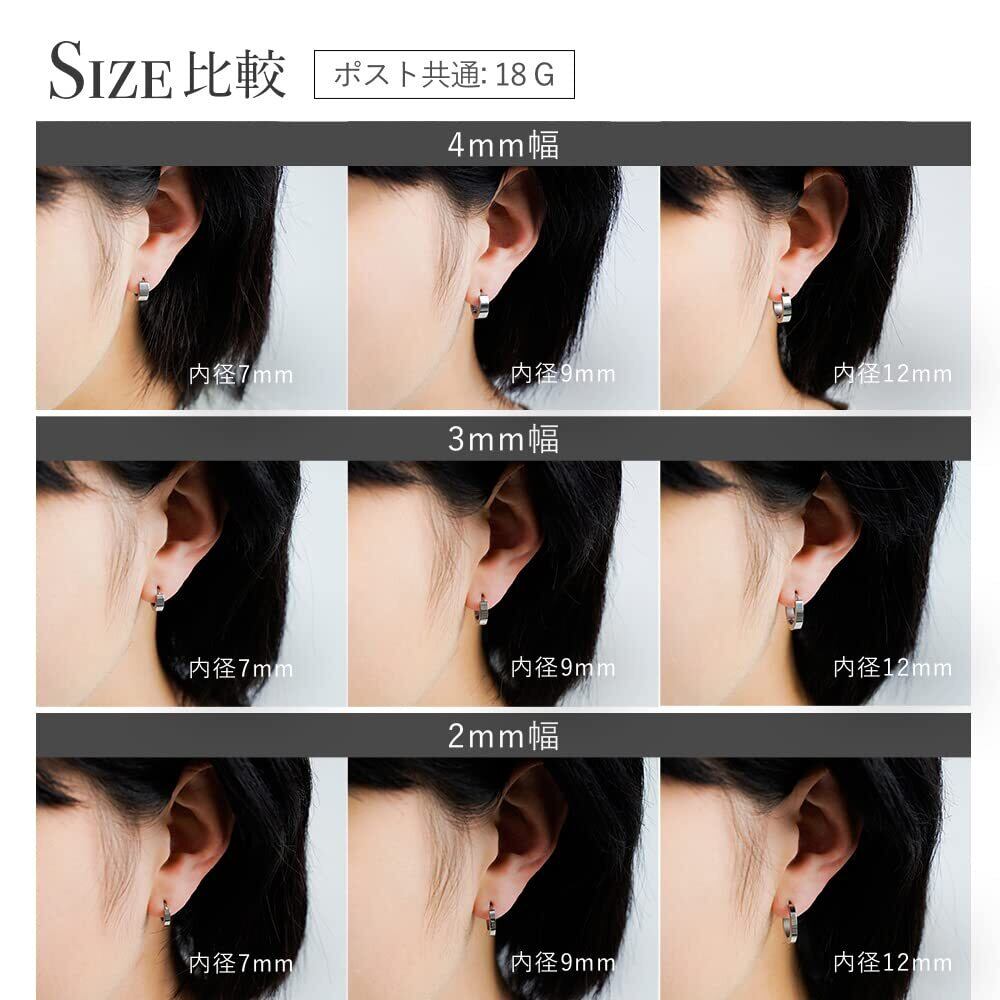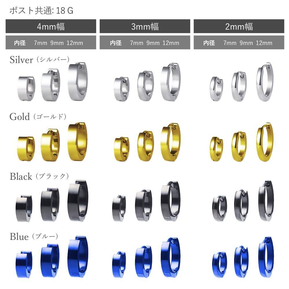 【バリエーション豊富な36種類!】カラーはシルバー、ゴールド、ブラック、ブルーの4色。サイズはフープ幅がそれぞれ2mm、3mm、4mm、ピアス内径がそれぞれ7mm、9mm、12mmの計36種類の中からお好きなカラー、サイズをお選びいただけます。