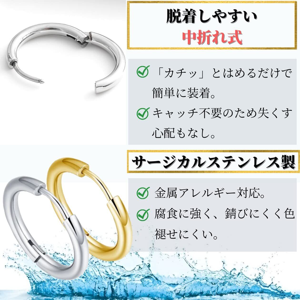 【簡単着脱の中折れ式】パカッ!と開いてカチッ!とはめる中折れ式を採用。キャッチレスなデザインのためキャッチをなくす心配もありません。フープピアスのポスト(針)は先端を丸く加工しているのでピアスホールに優しく、つけっぱなしでも問題ございません。