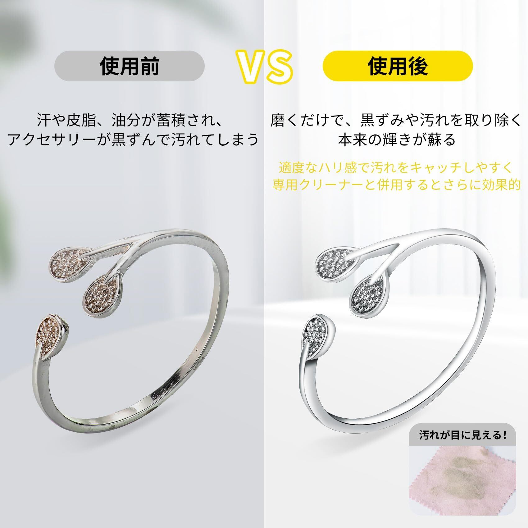 簡単お手入れ:アクセサリー表面を拭くだけで、軽いくすみをケアし、きれいな状態を保つことができます。汚れの程度により、シルバー磨きクロスを繰り返し使用する必要がある場合があります。※効果の感じ方には個体差があります