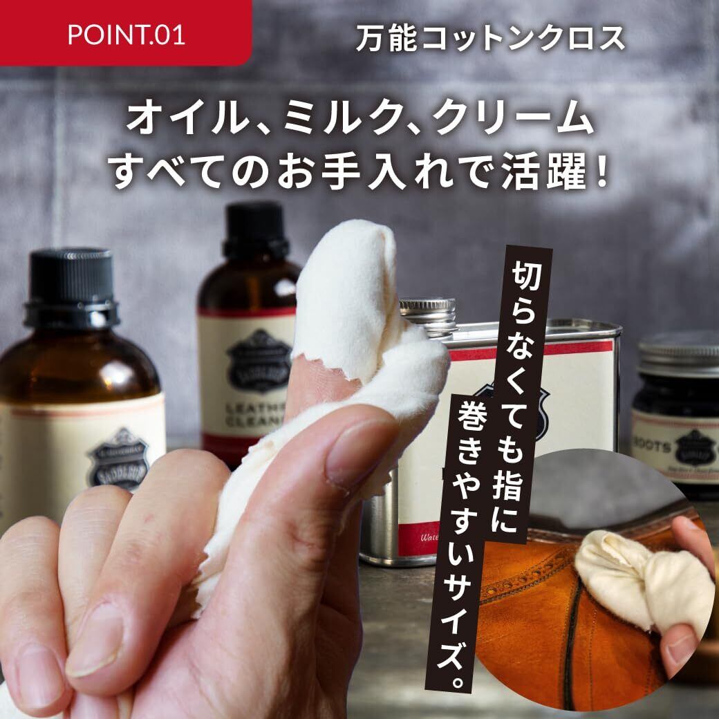 革靴、ブーツ、レザージャケット、グローブ、バッグ、財布などの革製品の汚れ落し、磨き上げ、ツヤだし、乾拭きなどオールマイティに使用できるクロスです。