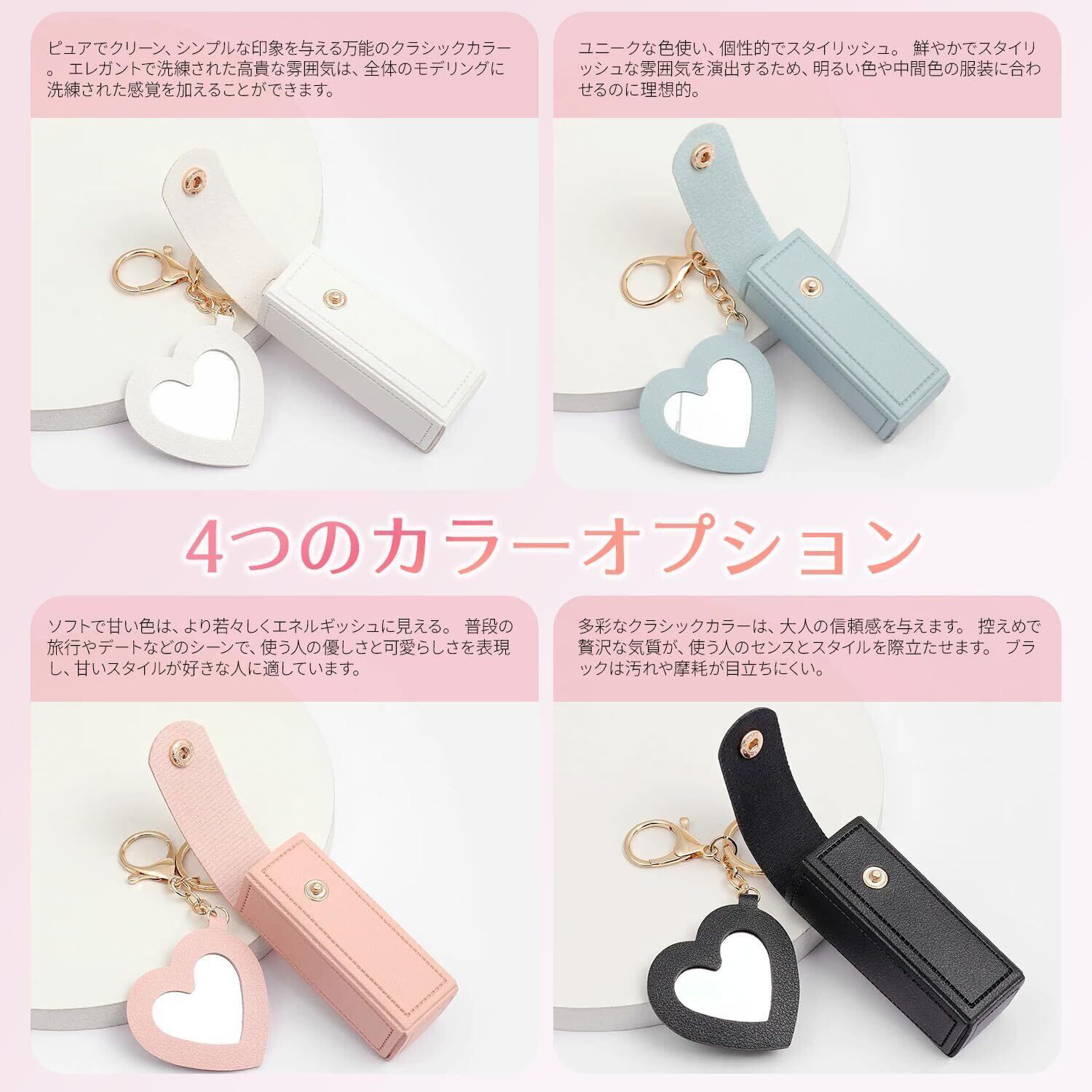 【ミラー付き】このリップスティックホルダーにはミニミラーが付いており、外出時にメイクやタッチアップをするのに便利なミニミラーが付いています。小さなミラーはPUレザーリングで包まれているので、壊れたり触れたりする心配はありません。レザーリングはより多くの保護を提供します。