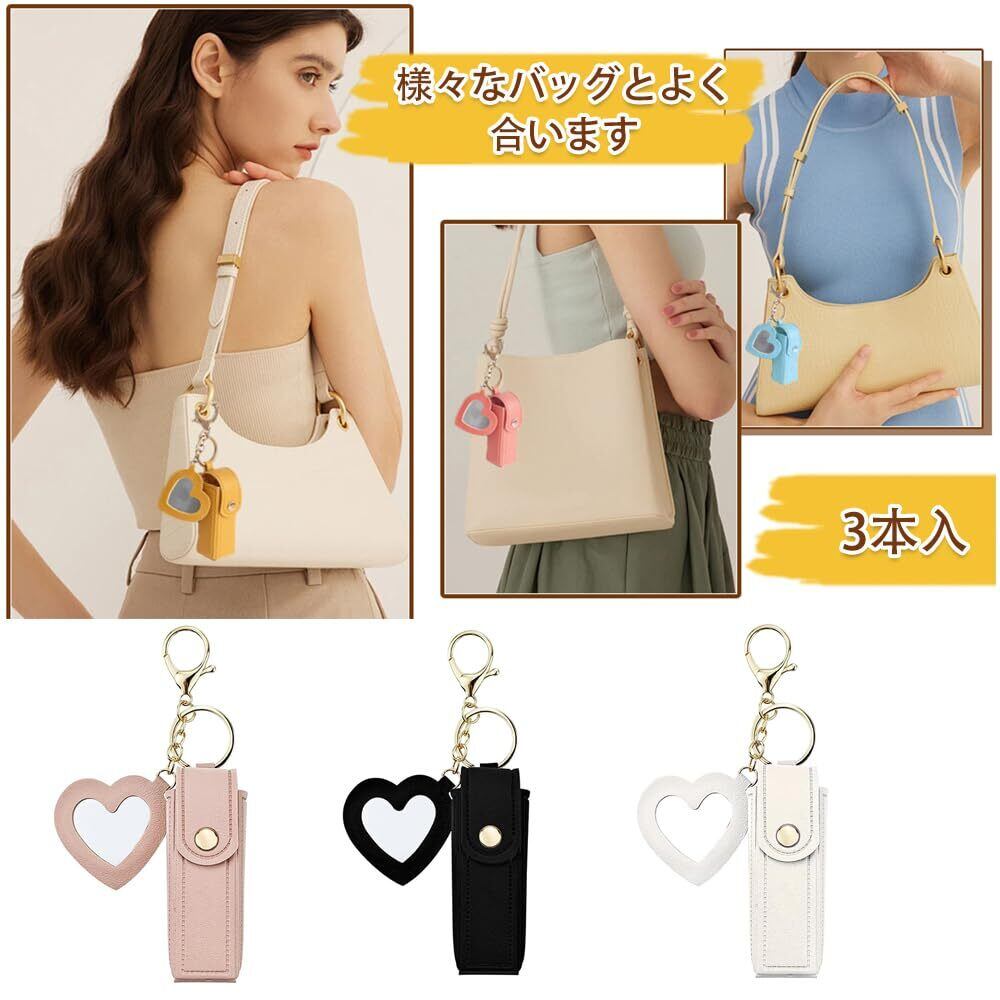 リップケース 3個セット リップポーチ 口紅 キーホルダー ミニ口紅バッグ リップケース 持ち運び PUレザー ケース ミラー付き かわいい お洒落 持ち便利 (ホワイト+ブラック+ピンク)
