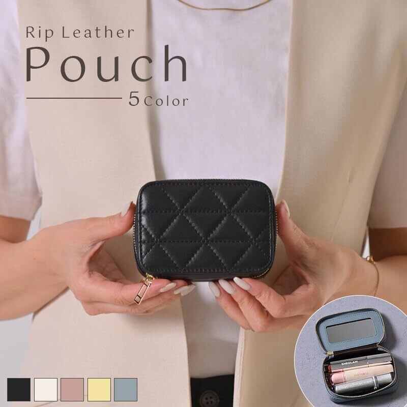 sezu リップケース ミラー付き 化粧ポーチ 鏡付き ミニポーチ メイクポーチ 小さめ 本革 レザー キルティング コンパクト コスメポーチ 持ち運び 収納 ギフト (ブラック)