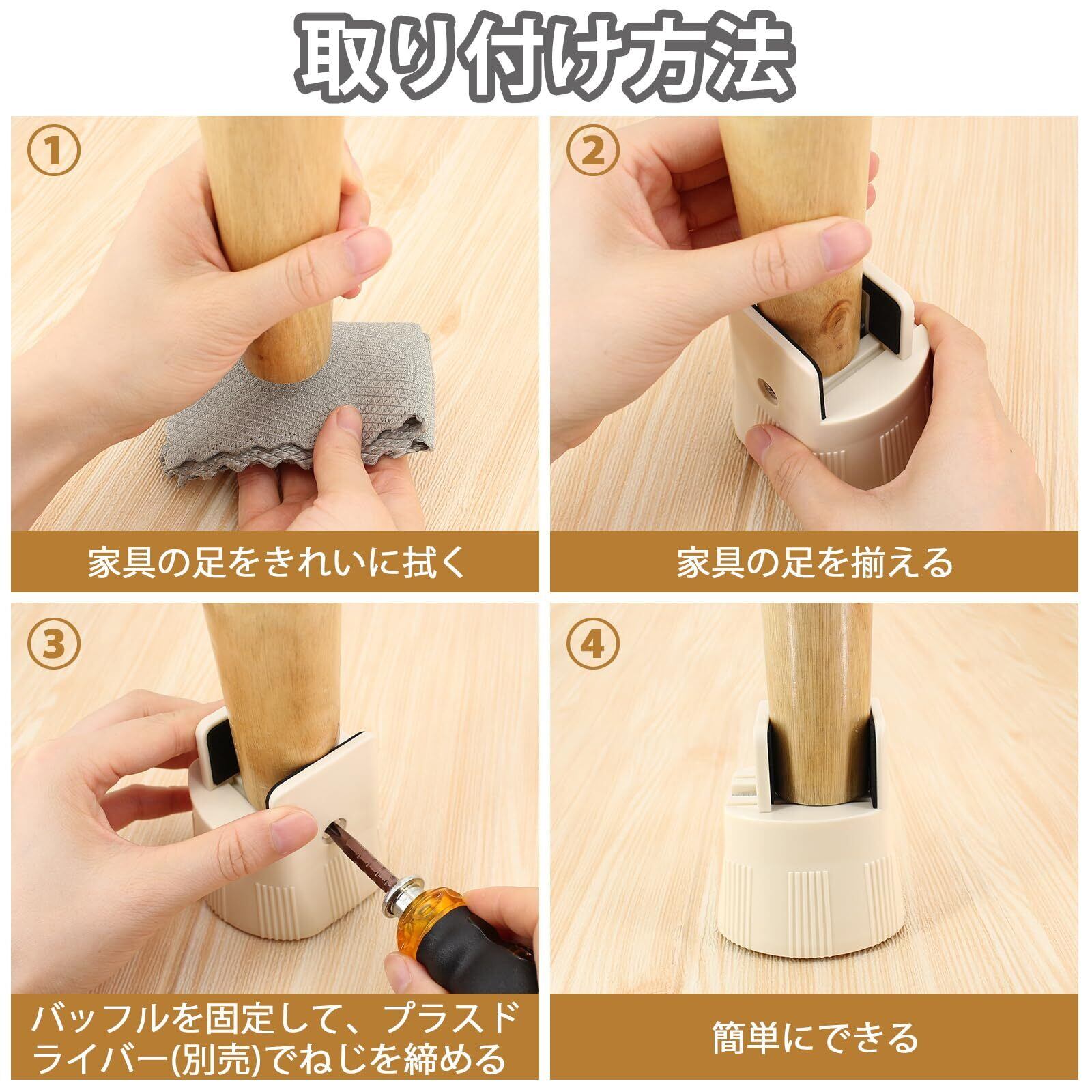 【巧みな設計】家具足のずれ落ちを防ぐするように小さなバッフル、締めネジを調節します。幅が0~5cm調節できるので、ほとんどの家電製品と家具の脚に相応しいです。また、バッフルと家具足の接続面にはやわらかいスポンジがデザインされ、傷つかないように家具足を保護します。●ご注意:ネジを締めて脚を固定するとき、プラスドライバー(別売)が必要です。