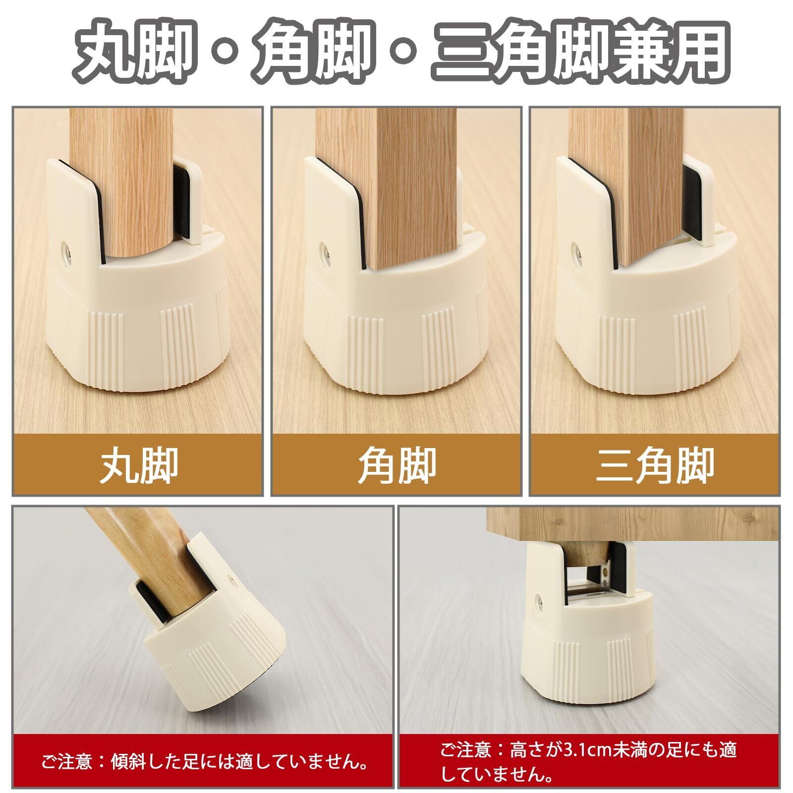 【適応対象】矩形足の短辺(丸足の直径、三角足の三角形の高さ)が5cm内のテーブル、こたつ、デスク、椅子、ソファー、ベッド、料理台、縦型・ドラム式洗濯機、食洗機などの家具・家電には適用されます。※ご注意:傾斜した足、高さが3.1cm未満の足には相応しくないです。