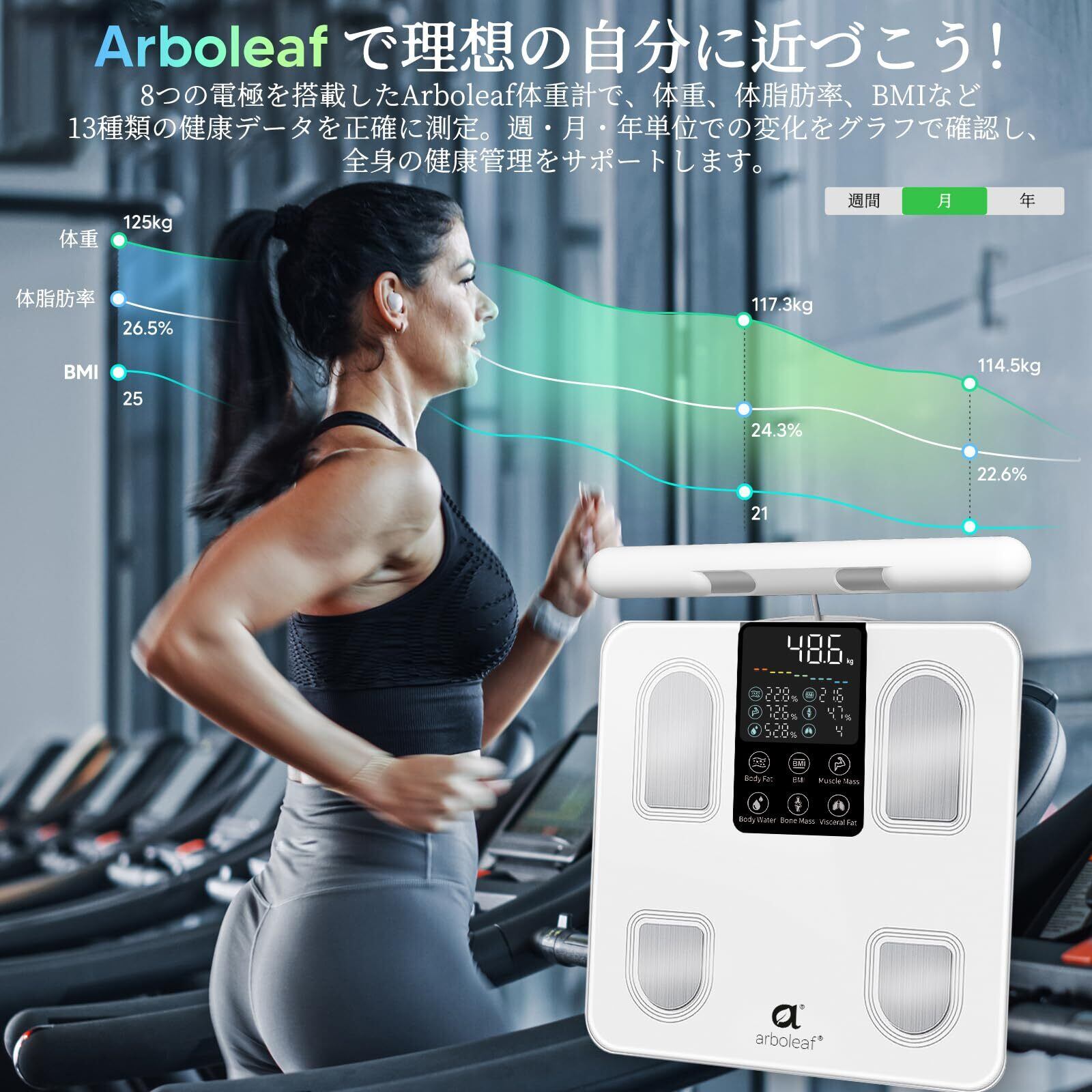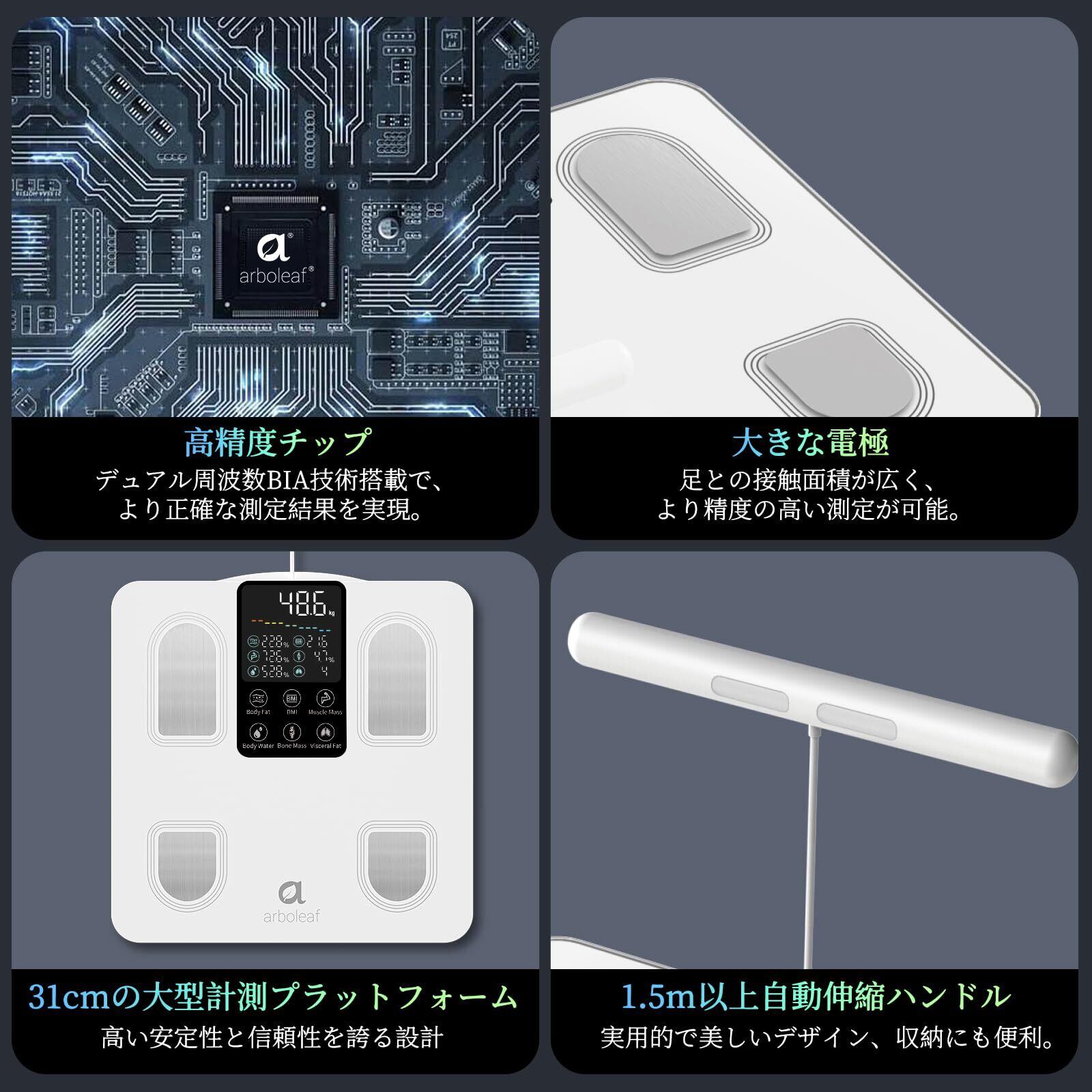 arboleaf 体重計 体組成計・体脂肪計 カラダスキャン スマホ連動 データ自動転送 部位別測定 全身測定方式 体重/体脂肪率/BMI/筋肉量/50項目測定 8電極 Bluetooth対応 アプリ対応/apple watch/GoogleFit/Fitbit/appleヘルスケア連携 高精度/登録者無制限/自動認識 ヘルスメーター 電池付属 保証 人気アプリ連動可能