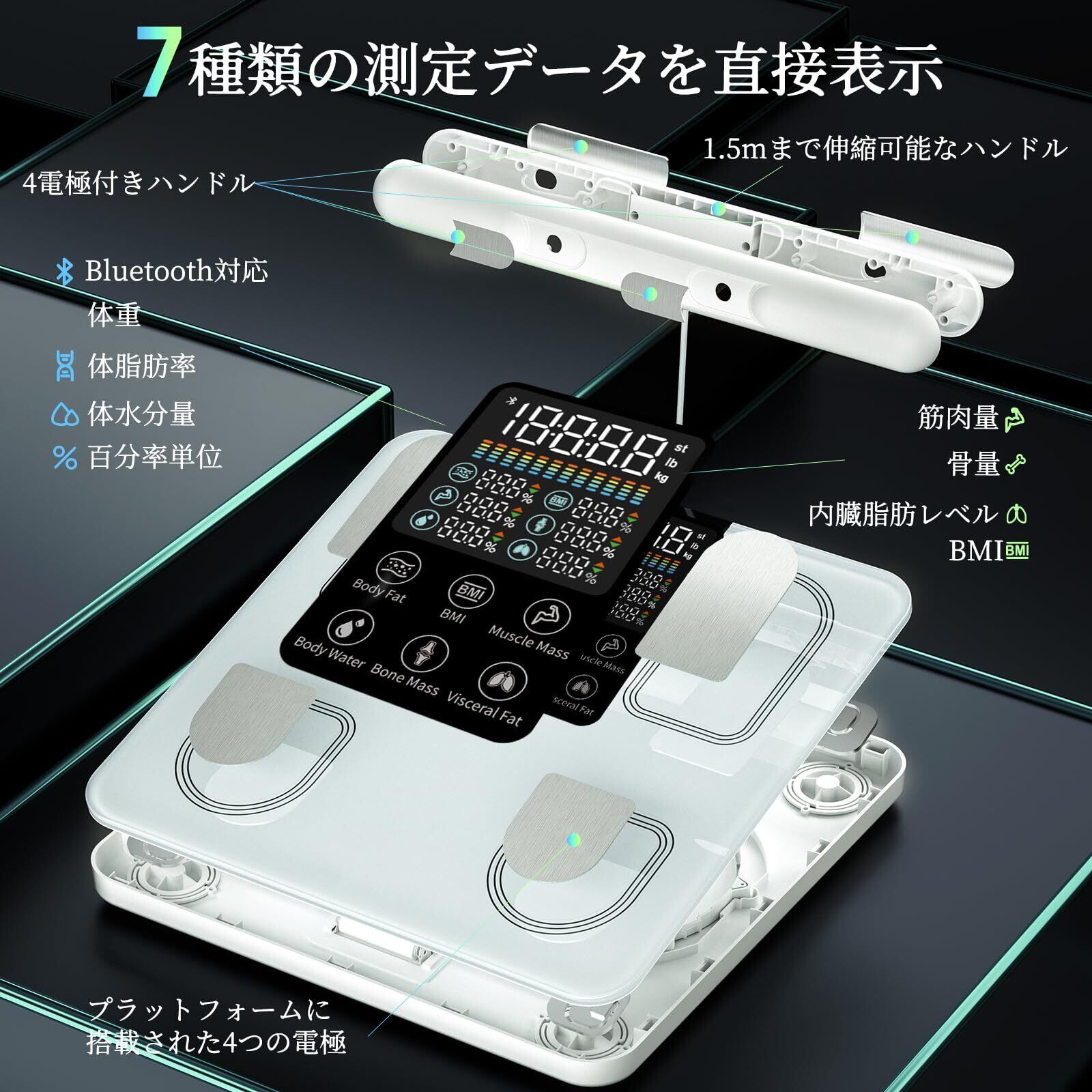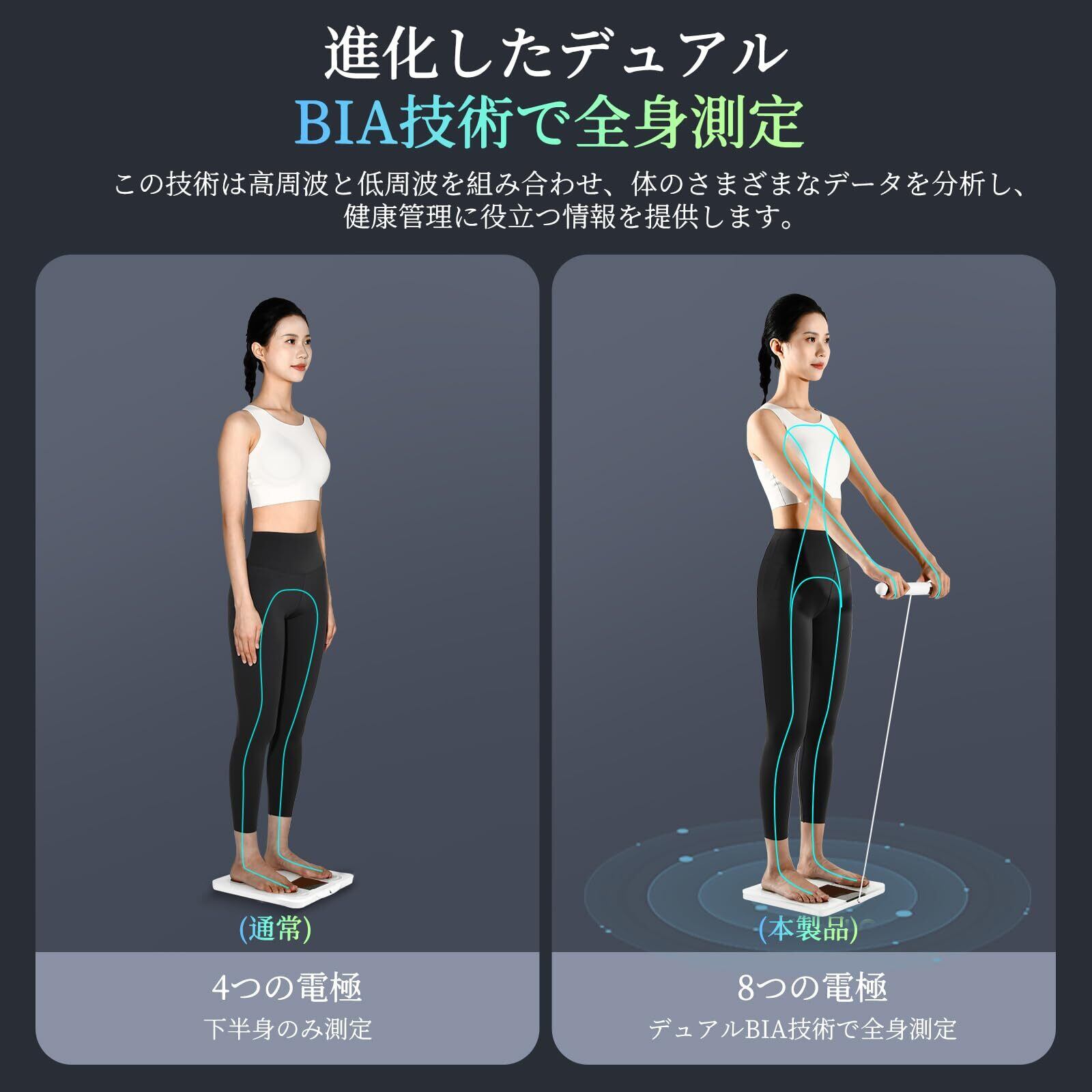 Apple Health、Google Fit、Health Connect、Fitbit連携, スマホ連動/Bluetooth対応, 自動認識, 部位別測定(グリップを握る8電極方式の採用), 高精度デュアル周波数測定