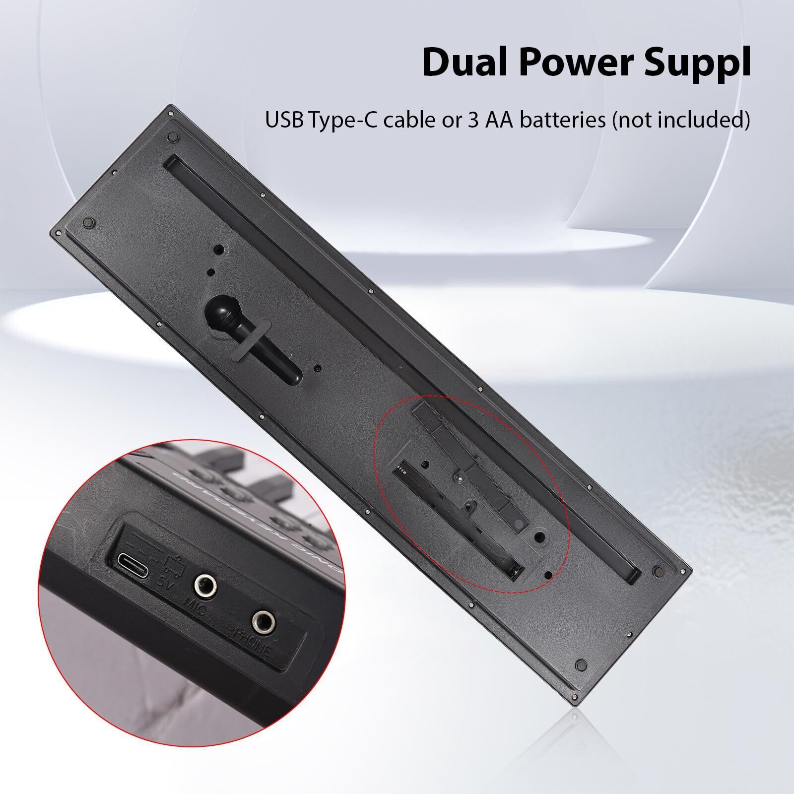 【デュアル電源】:当社の電子ピアノはUSB Type-Cケーブルまたは単三電池3本(別売)で給電でき、自宅でも外出先でも、より柔軟で便利に演奏できます。