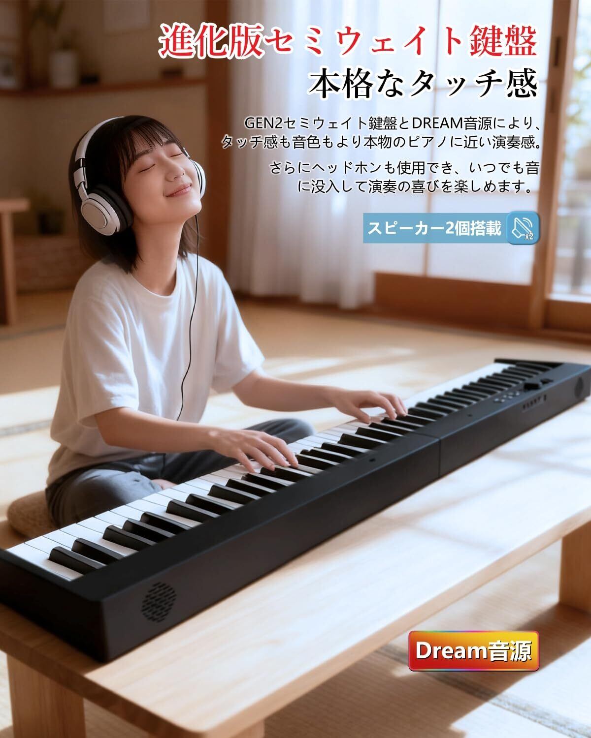 【本格的な弾き心地】黒鍵:12mm(幅)、8mmストローク 白鍵:22mm(幅)、10mmストロークで、生ピアノと同じサイズの88鍵盤を搭載し、独自開発したハンマー感技術により、低コストでハンマーに似たタッチ感を実現していますが、タッチ感を軽い設置で初心者にも、携帯練習にも適しています。また、白鍵盤は象牙調仕上げで長時間の演奏で指が汗ばんでも滑りにくく、グランドピアノに近い弾き心地を実現しました。