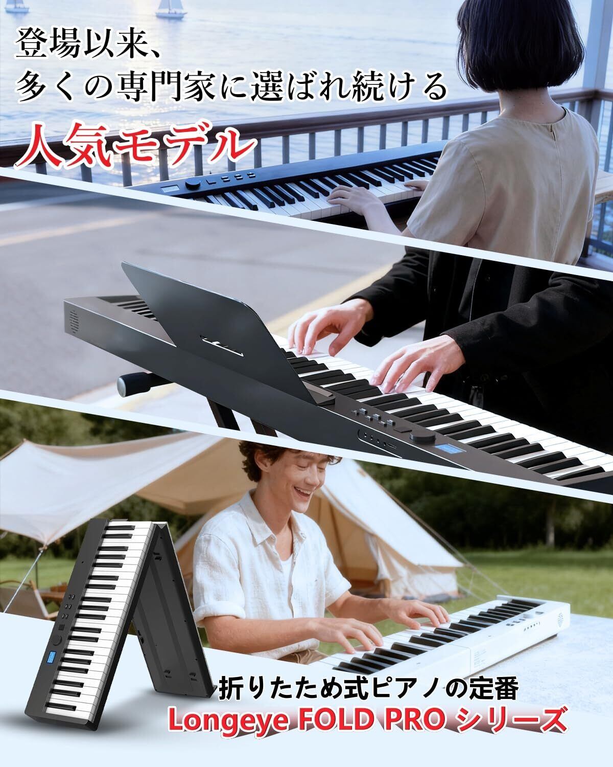 【88鍵盤充電式、且つ折り畳み可能--Longeye FOLD PROが誕生!】大容量バッテリ内蔵し、折り畳んだ後わずか4kg、61.3*21.7*11.4㎝サイズで、専用ケースも付く。さらに、背面のボタンを押すだけで折り畳め、ロックの紛失恐れもなし。コンパクトで軽量なデザインのため、どこにでも持ち運びが可能で、特に旅行や外出先での使用に最適です。