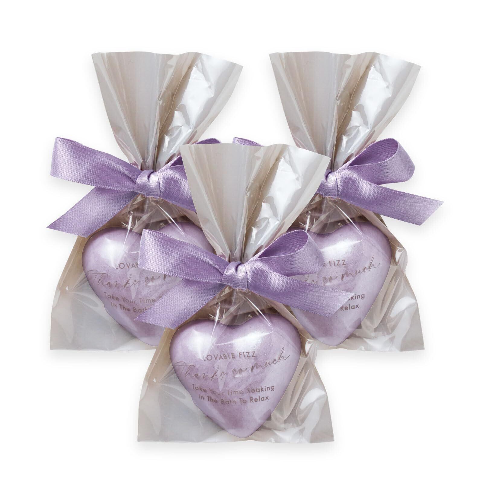 きらめくパウダーを纏ったハートモチーフ。可愛らしいリボン付きのパッケージ。結婚式やお礼、お祝い、お返し等のプチギフトにおすすめの入浴料