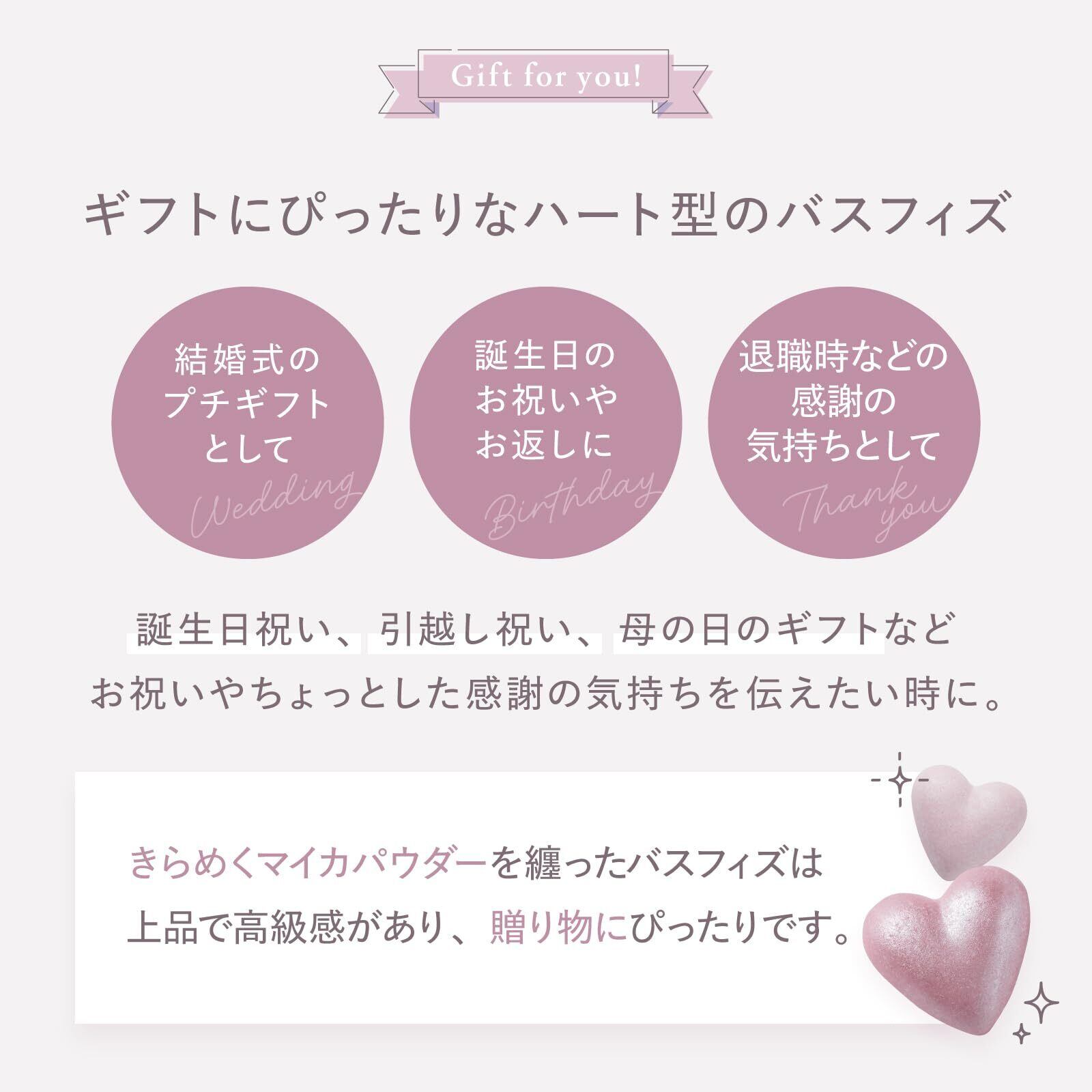 きらめくパウダーを纏ったハートモチーフ。可愛らしいリボン付きのパッケージ。結婚式やお礼、お祝い、お返し等のプチギフトにおすすめの入浴料
