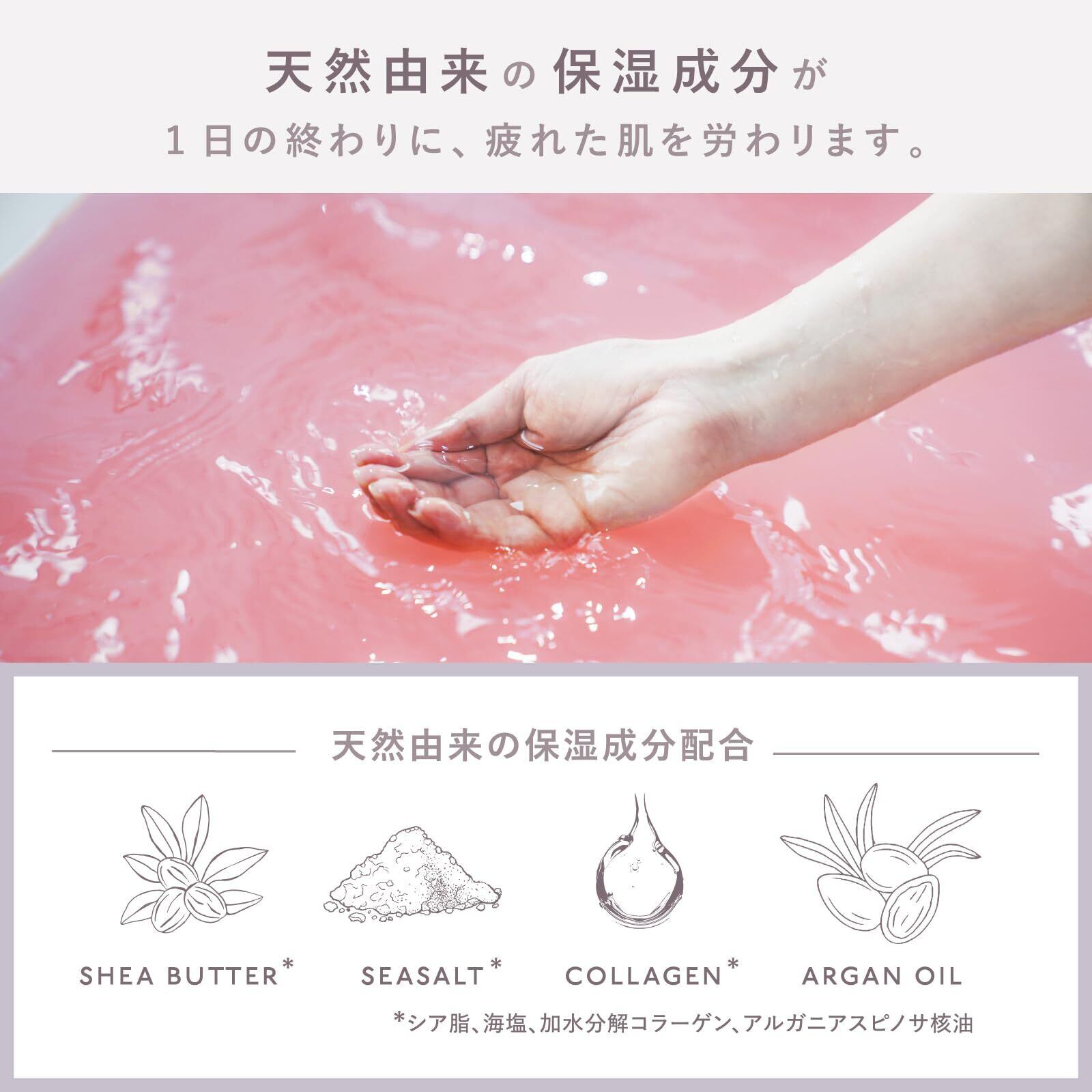 天然由来の保湿成分(シア油、海塩、加水分解コラーゲン、アルガニアスピノサ核油)配合。お湯に溶かすとやさしく発泡し、ほんのり色味のついた「にごり湯」になります