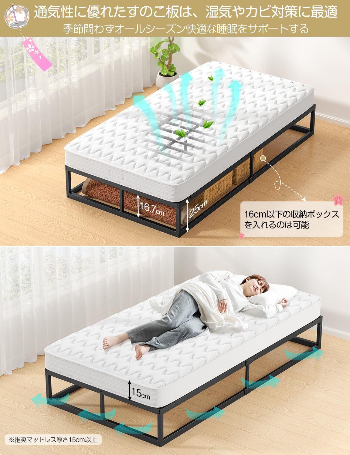 【通気性良い・ベッド下収納高さ17cm】シンプルで頑丈で、見た目でどんな部屋にも合わせやすいパイプベッド。スチール製すのこ構造なのでカビの心配がなく通気性も◎。高さが低めなので、窓の下や斜め天井の下にも最適。低めでも、ベッド下には17cm以下の収納ボックスが入るゆとりのスペースがあります。