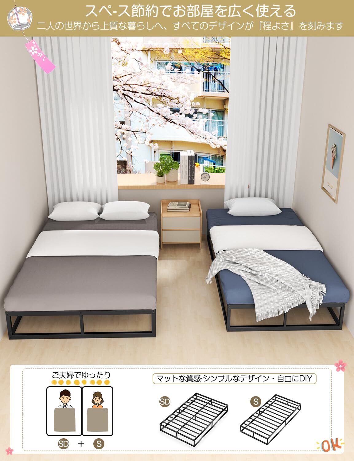 【耐荷重300Kg】すのこの厚さ20×20mm×12本がある上、強力サポートの[エ]字結構[厚さ40*20mm]の組み合わせでベッドフレームの総体負荷を分散される丈夫な構造でグラつきなし・安定・静音・高い耐荷重を実現されるポイントです。