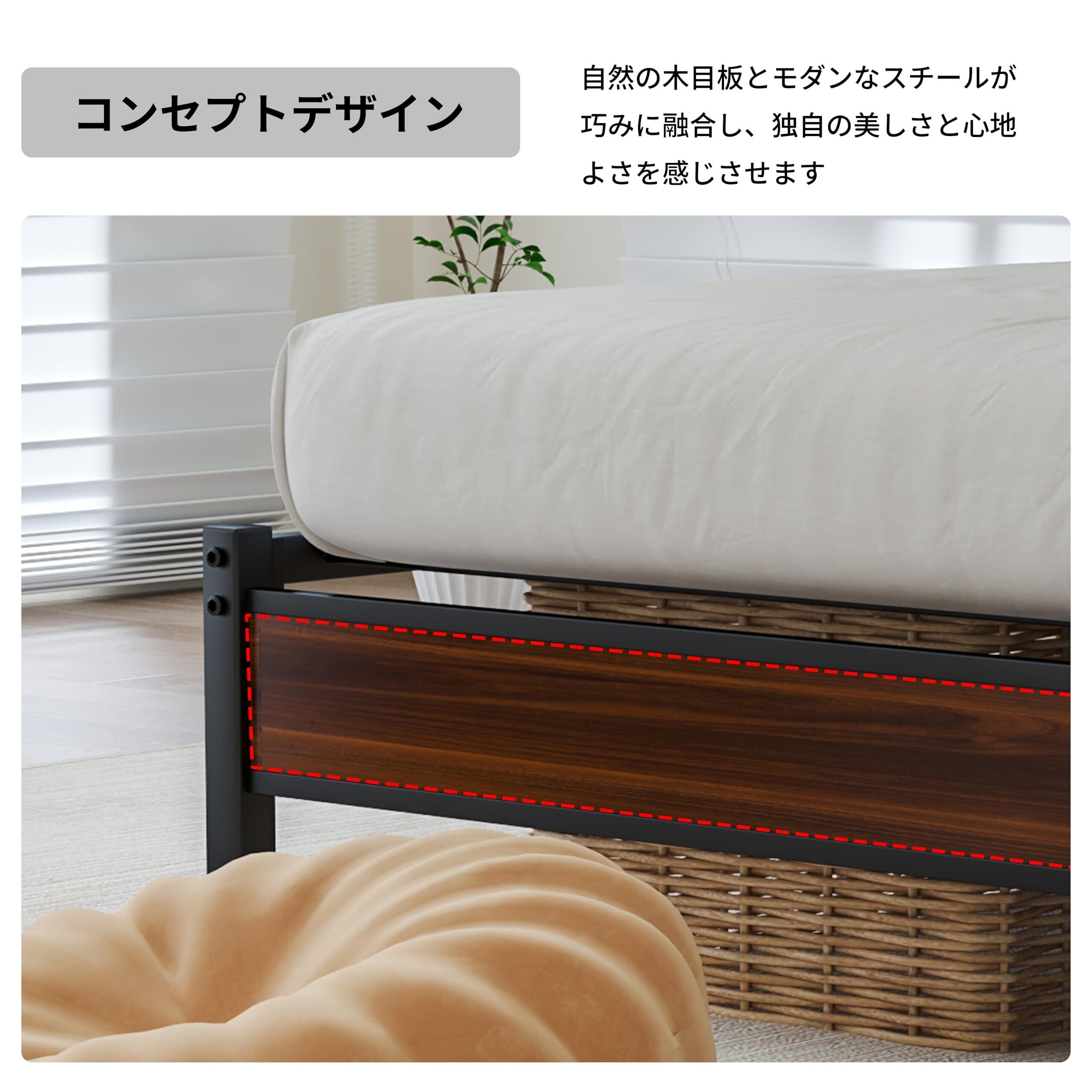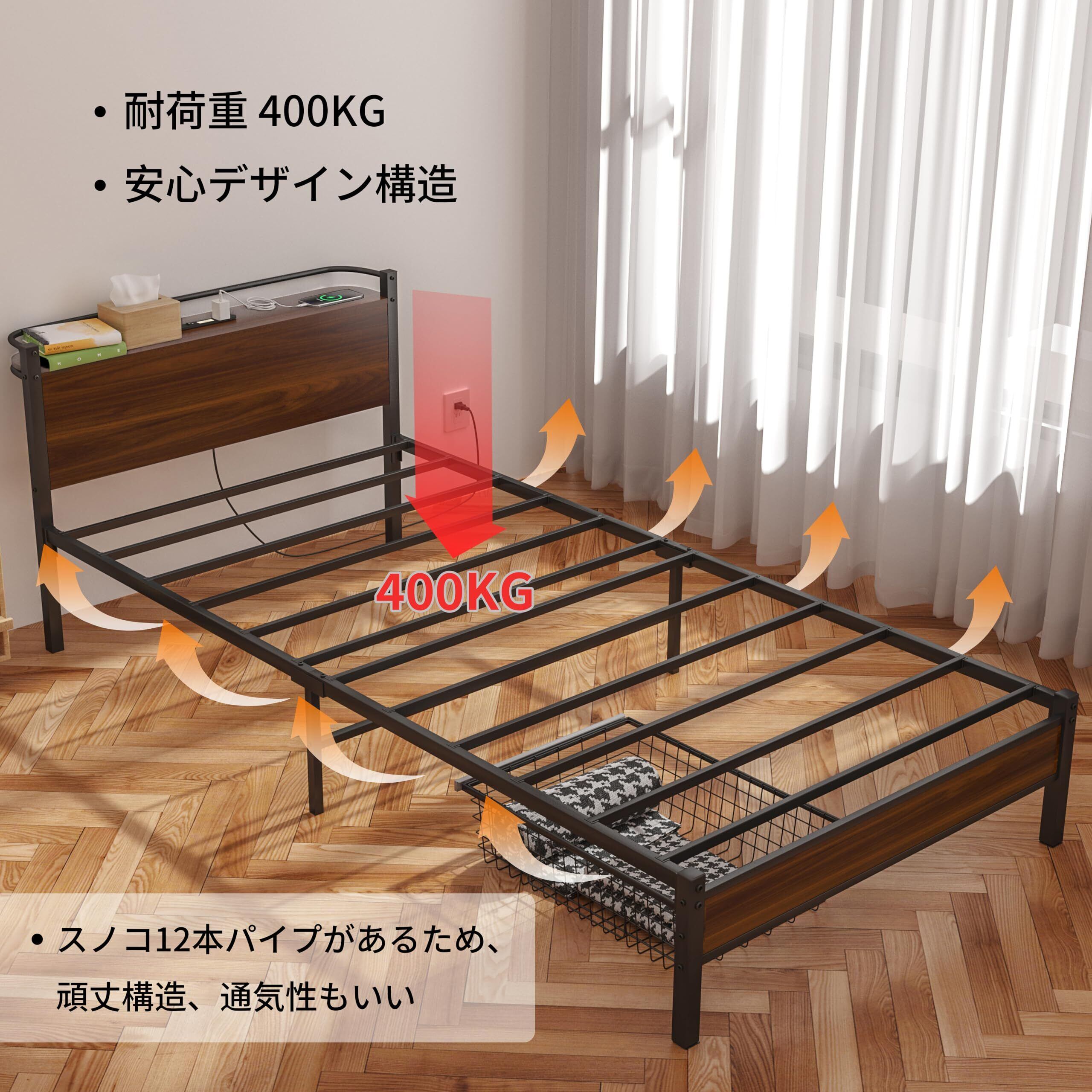 【安全構造】日本デザインの安全構造で、スノコ耐荷重400kg、サイドフレーム350kgと高い耐久性を誇ります。ベッドフレームはエポキシ樹脂塗装のスチール材を使用し、長期間の使用に耐えられます。通気性の良いスノコ構造と静音設計を両立。太いパイプでがたつき・きしみ音を徹底抑え、静かな睡眠環境を守ってくれます。