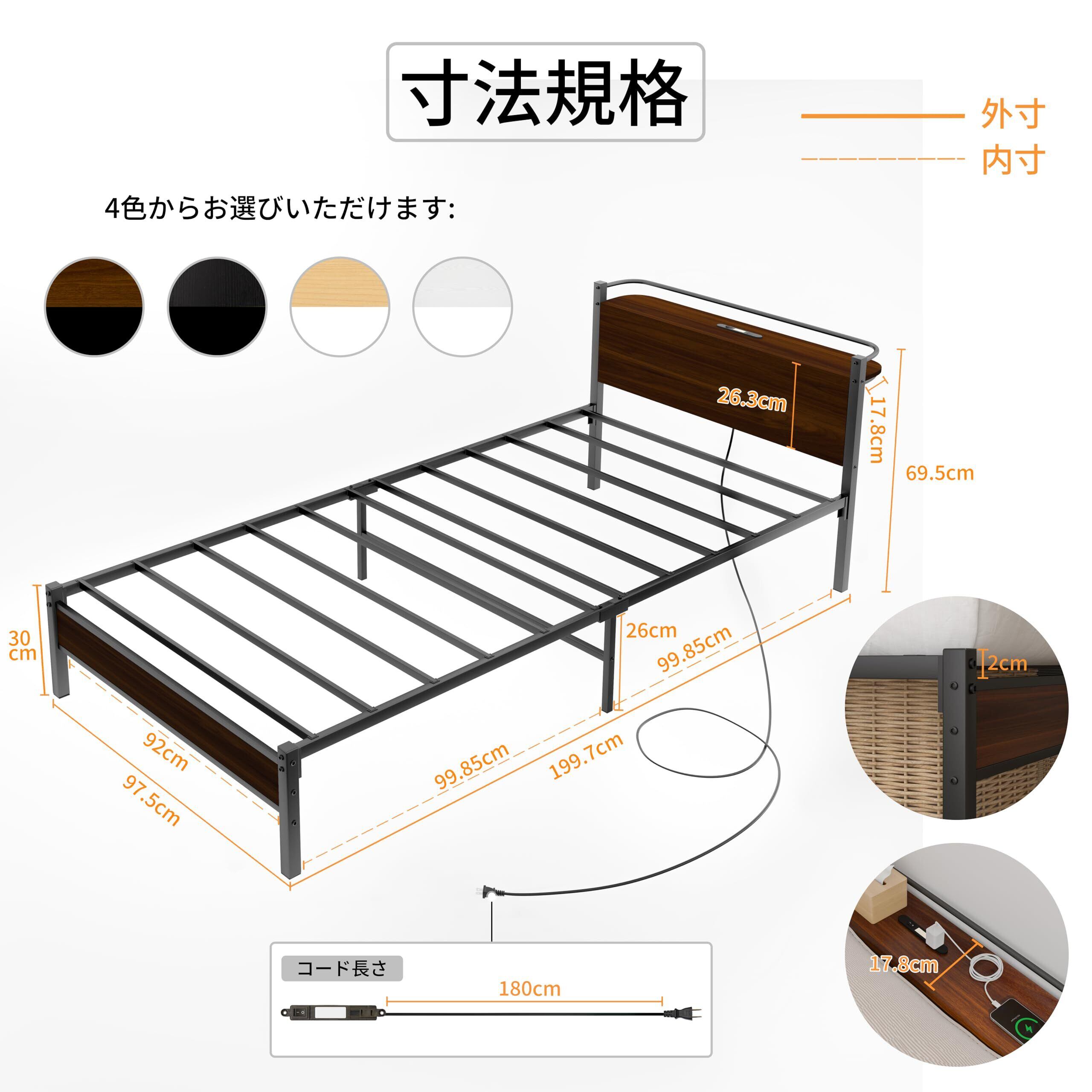 【サイズ】外寸:幅97.5×奥行217.5×高さ69.5cm、内寸:幅97.5×奥行き199.7cm×30cm(シングルサイズのマットレス対応)、重量:13.5kg、ベッド下の収納高さ:26cm、組立目安:15-20分。