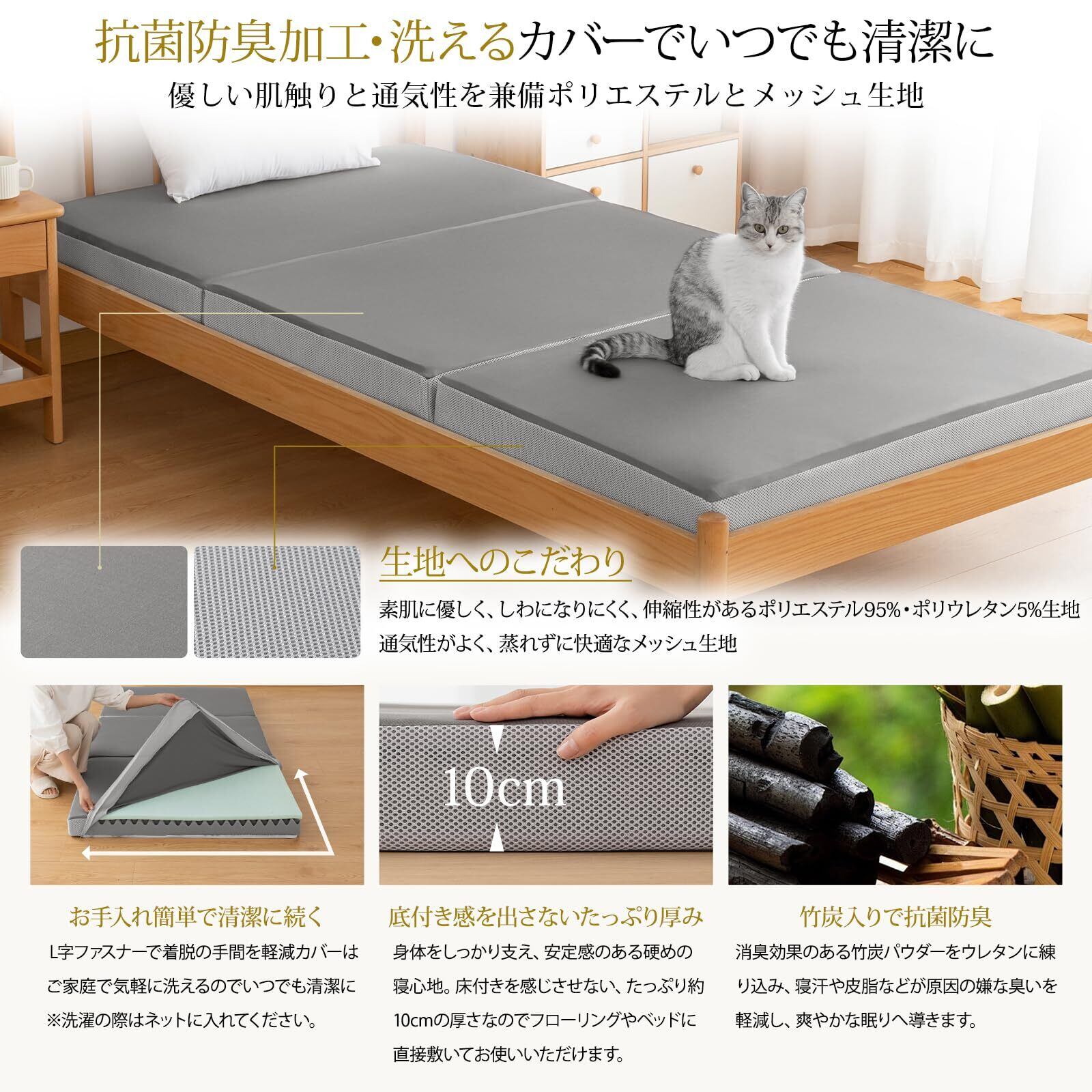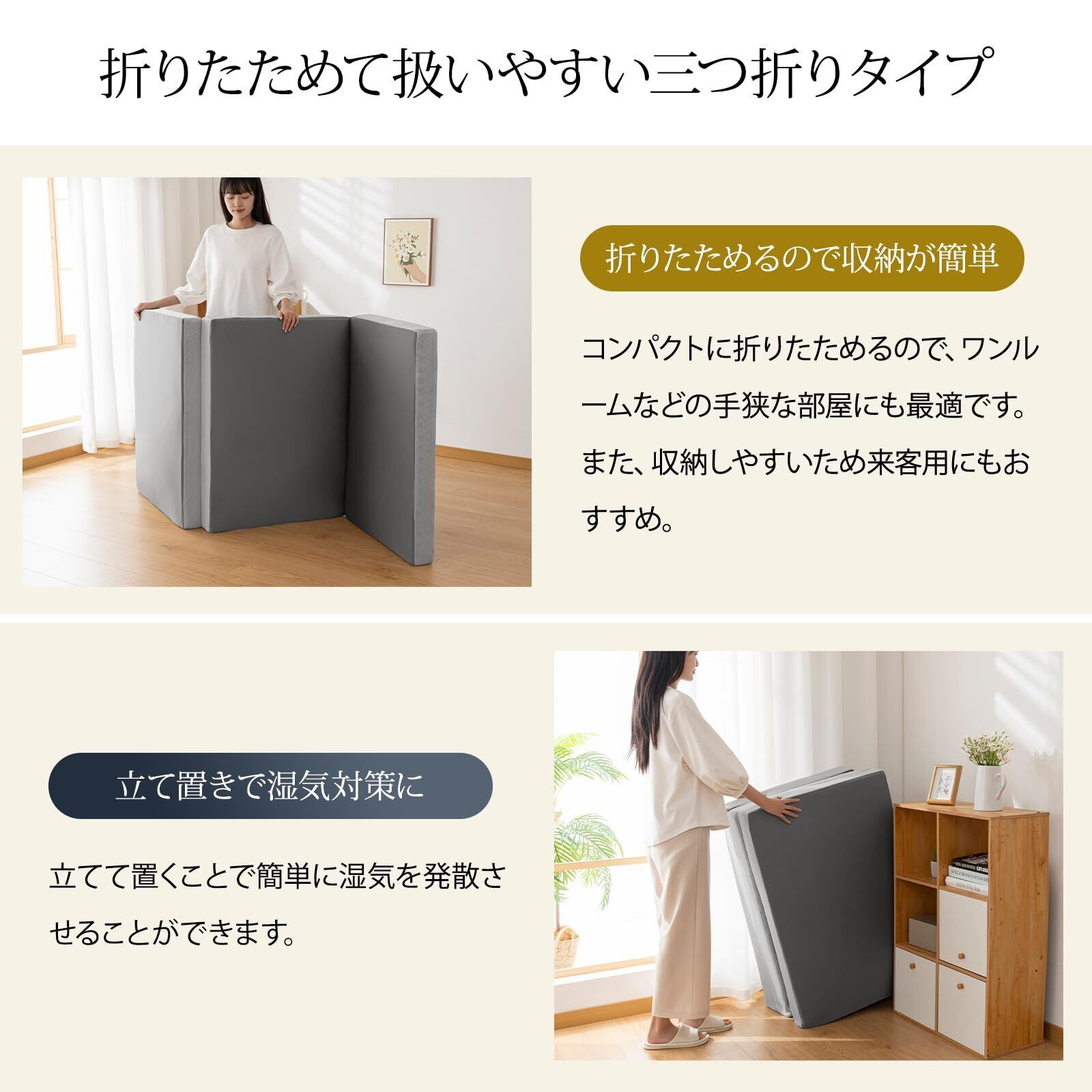 【コンパクトで収納便利】マットレスコンパクトに折りたためるので、ワンルームなどの手狭な部屋にも最適です。また、収納しやすいため来客用にもおすすめ。女性でも持ち運びもラクラクになります。コンパクトで様々な場所で使用できます。女性も楽に持ち運べます。また立て置きすることで簡単に湿気飛ばしできます。