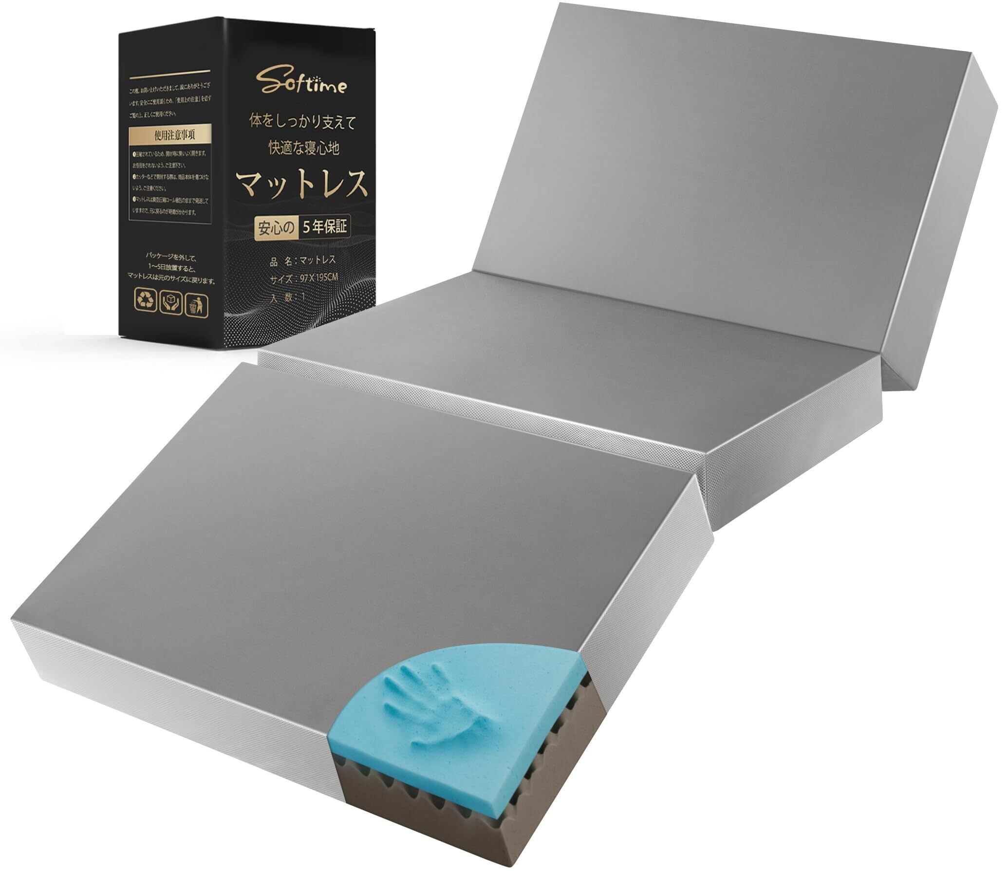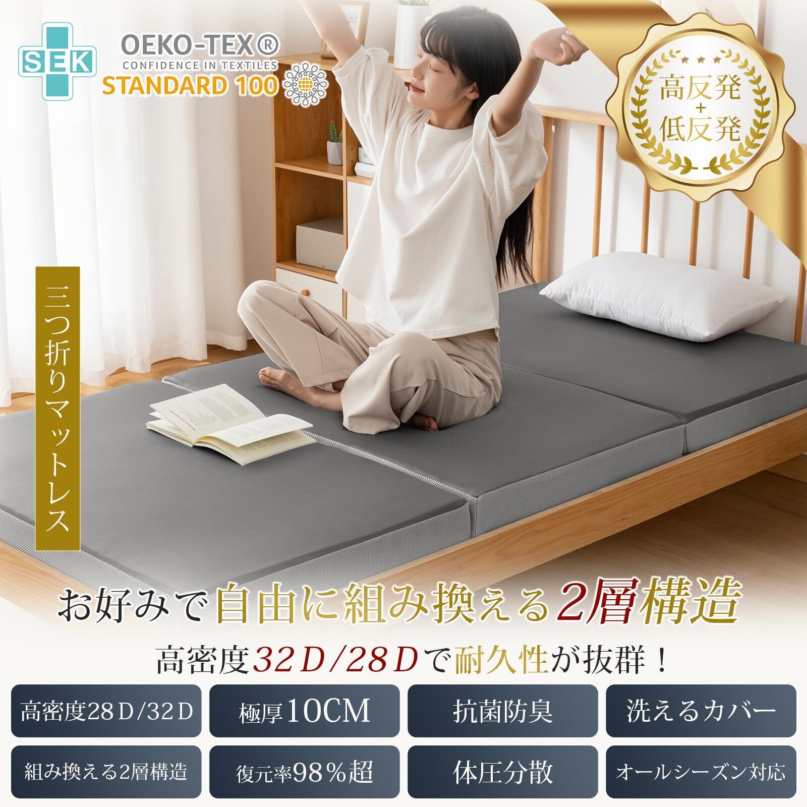 Softime マットレス シングル 3つ折り【高反発 ・低反発 2層構造】【硬め200N 高密度32D/28D 極厚10cm 】折りたたみマットレス 5年保証 抗菌防臭 防ダニ 高反発マットレス 折り畳み 体圧分散 洗えるカバー 圧縮梱包 97x195cm グレー F3