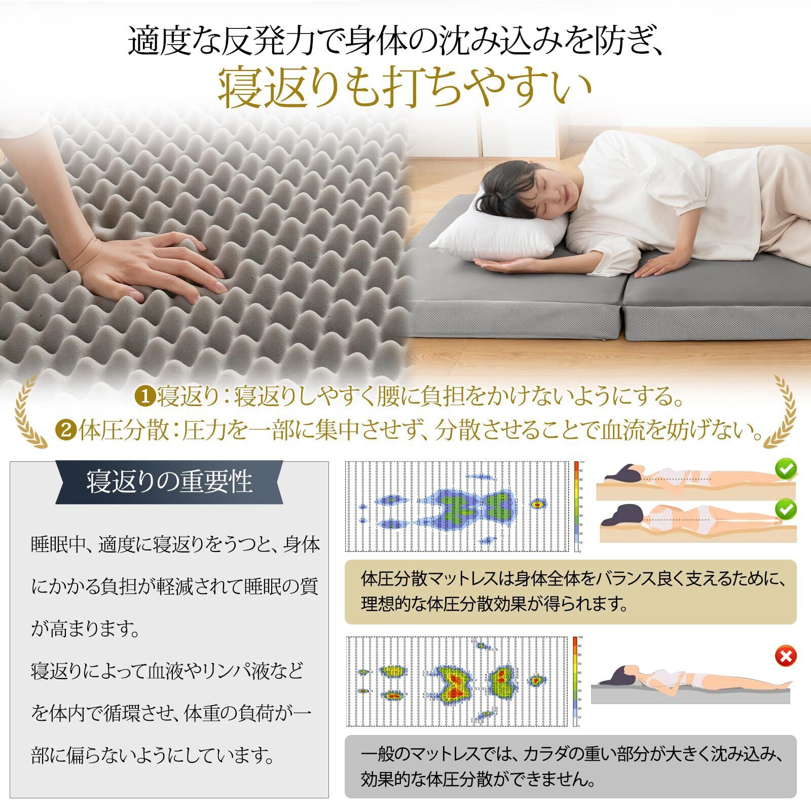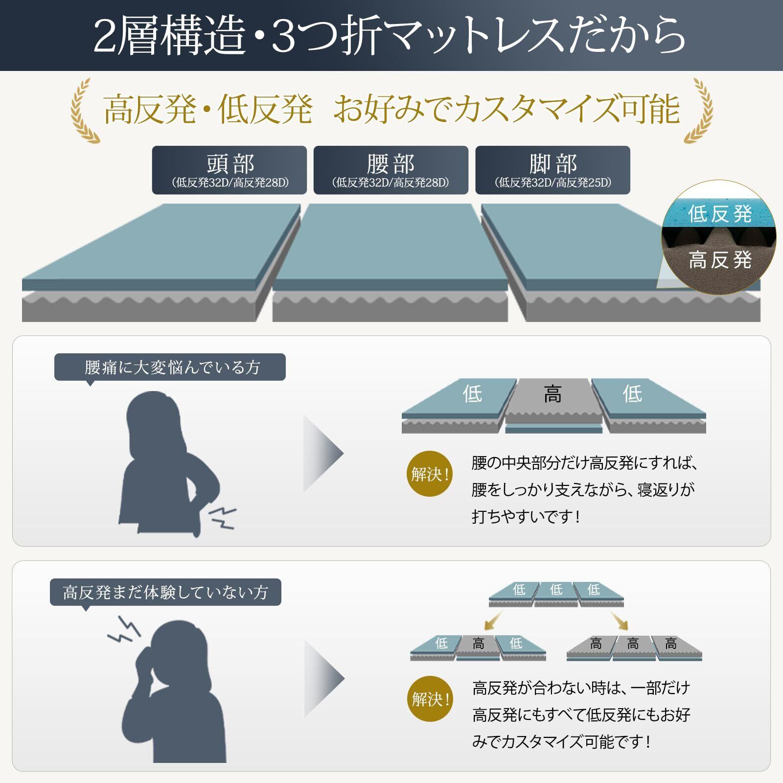 【高反発・低反発・2層構造】この三つ折りマットレスは高反発・低反発ー2層構造ウレタン設計を採用し、上部には2cmの低反発ウレタンに高密度32Dを組み合わせ、全身を包み込まれるような寝心地、体勢が安定して、リラックスした眠りが得られます。下部には8cmの竹炭ウレタンに高密度25D/28D 200N硬度を組み合わせ、体に強力なサポートを提供し、腰を過度に沈ませず、楽な寝返りを実現。頭・腰部分には28Dウレタンを採用して、腰部分をしっかり支える!※ブルーウレタンは長時間空気にさらされると、自然酸化により色が黄色く変化する場合がございますが、これは自然な現象で品質や使用性に影響はありません。