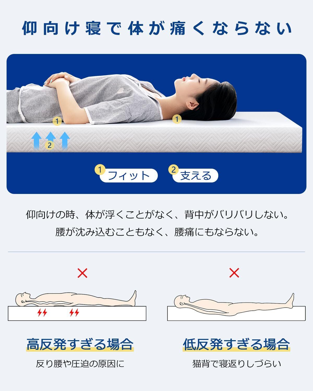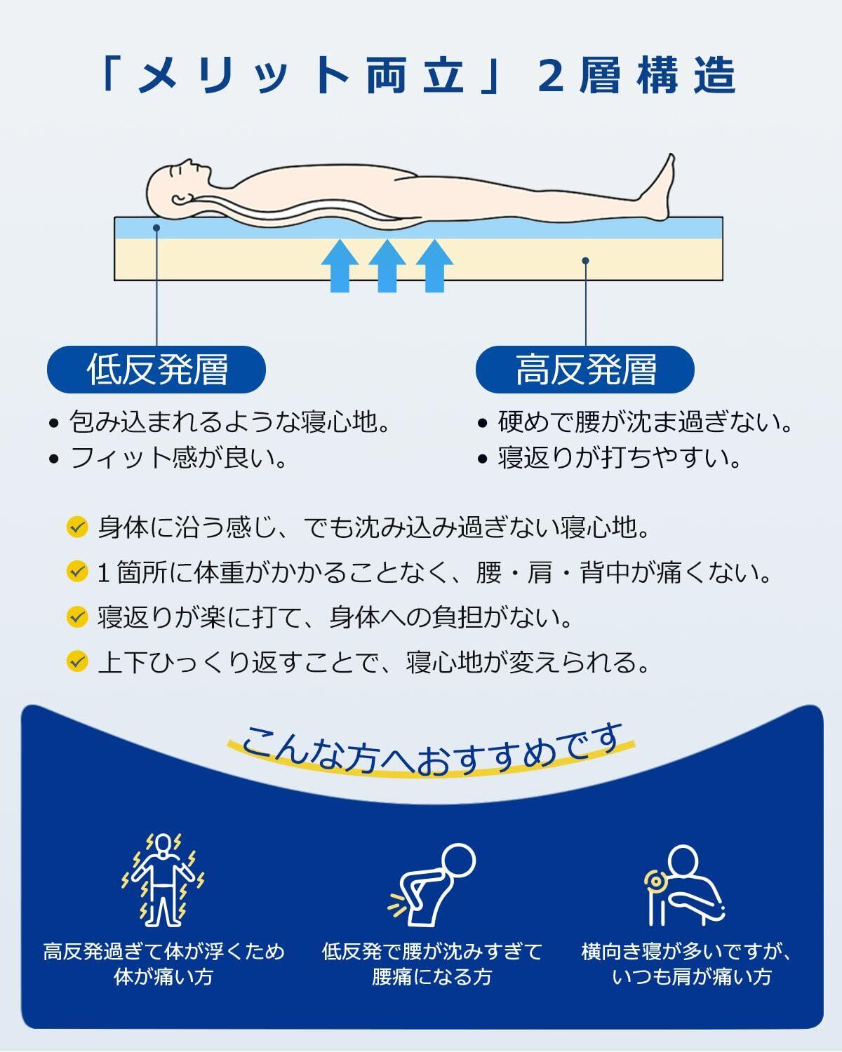 【背中がバリバリしない】高反発による寝返りと、低反発による体圧分散のいいとこ取りを実現した2層構造のマットレスです。低反発層で適度に沈み込み体にフィットしつつ、高反発層でしっかり支えて寝返りをサポートし、腰や背中への局所的な負担が小さくなり、腰・背中が痛くならないです。