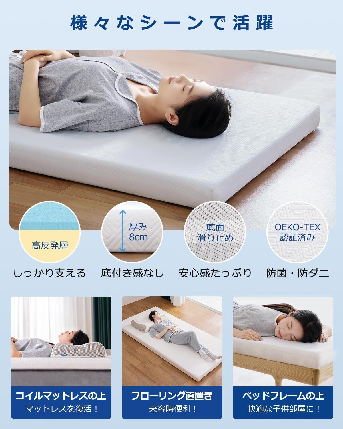 【暮らしを便利に】リビングや、寝室はもちろん、さまざまな場所で使用できる睡眠マットレスです。ベッドや敷布団に重ねても、畳・床に直置きしても使用可能ですので、古くなったマットレスを復活、また来客時にはとても便利です。