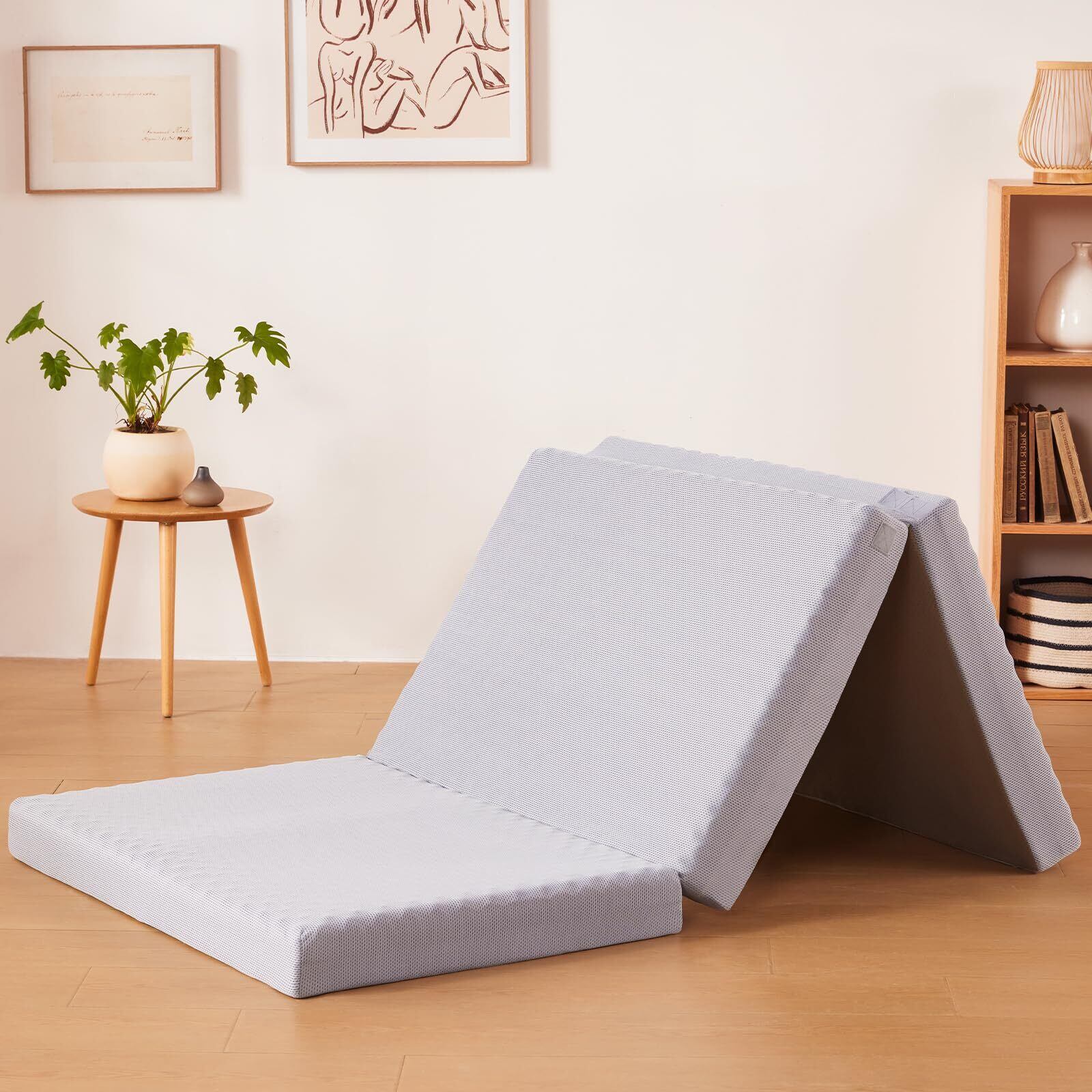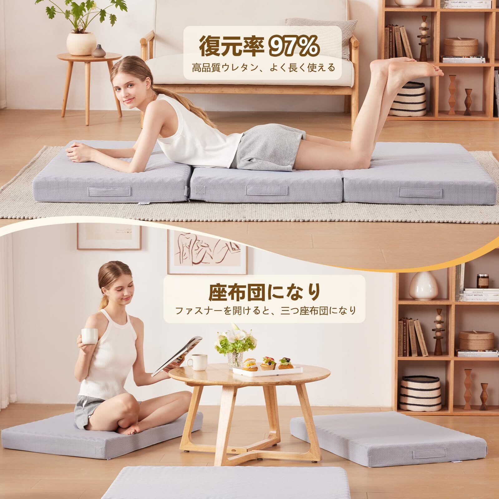 【クッションになる】三つ折りのマットレスは簡単に収納でき、折りたたむとコンパクトに収めることができます。お客様が来た際には、折りたたみマットレスの中央のファスナーを開けることで、3つの10cm厚のクッションに変わります。お部屋にぴったりとマッチします。