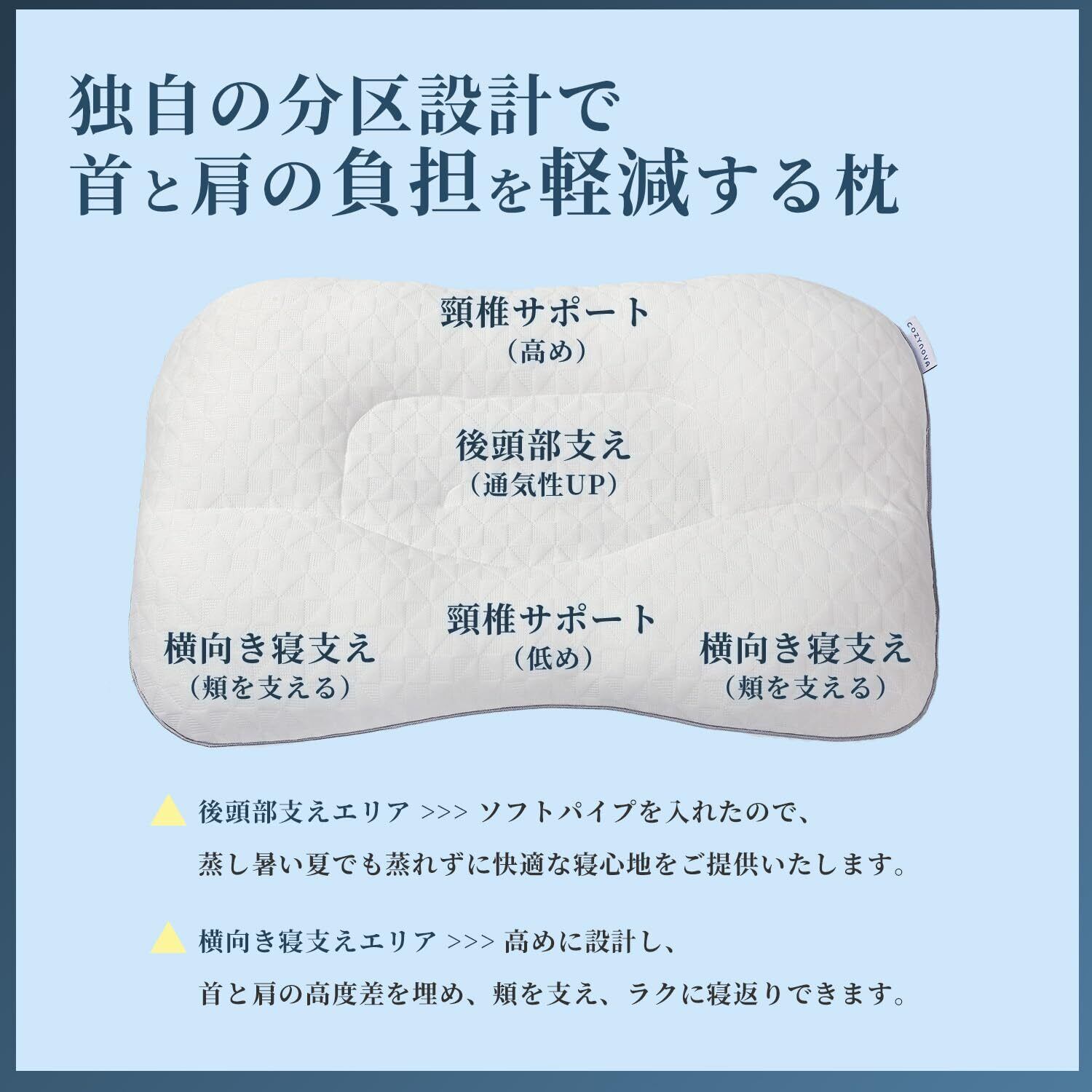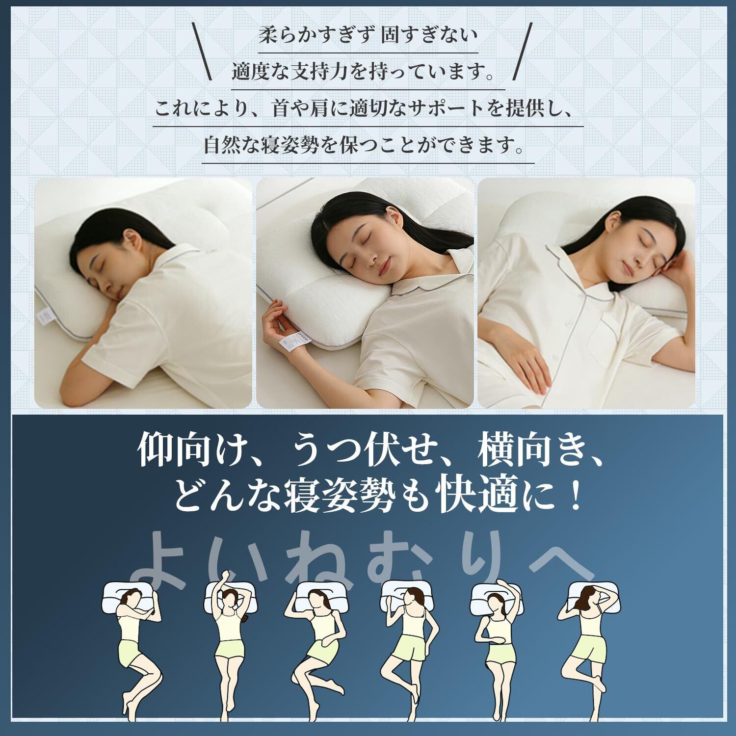 【どんな寝姿勢でも】中央のくぼみと両側カーブの設計により、しっかりと頭、首、肩をやさしく支えています。 仰向け に寝る場合、頭と首への圧力が軽減し、寝姿勢が安定します。また、枕の両側が高くしたので、 横向き で寝ると自然に頭が上がり、重心が真っすぐになり、気道が確保され呼吸が楽になります。