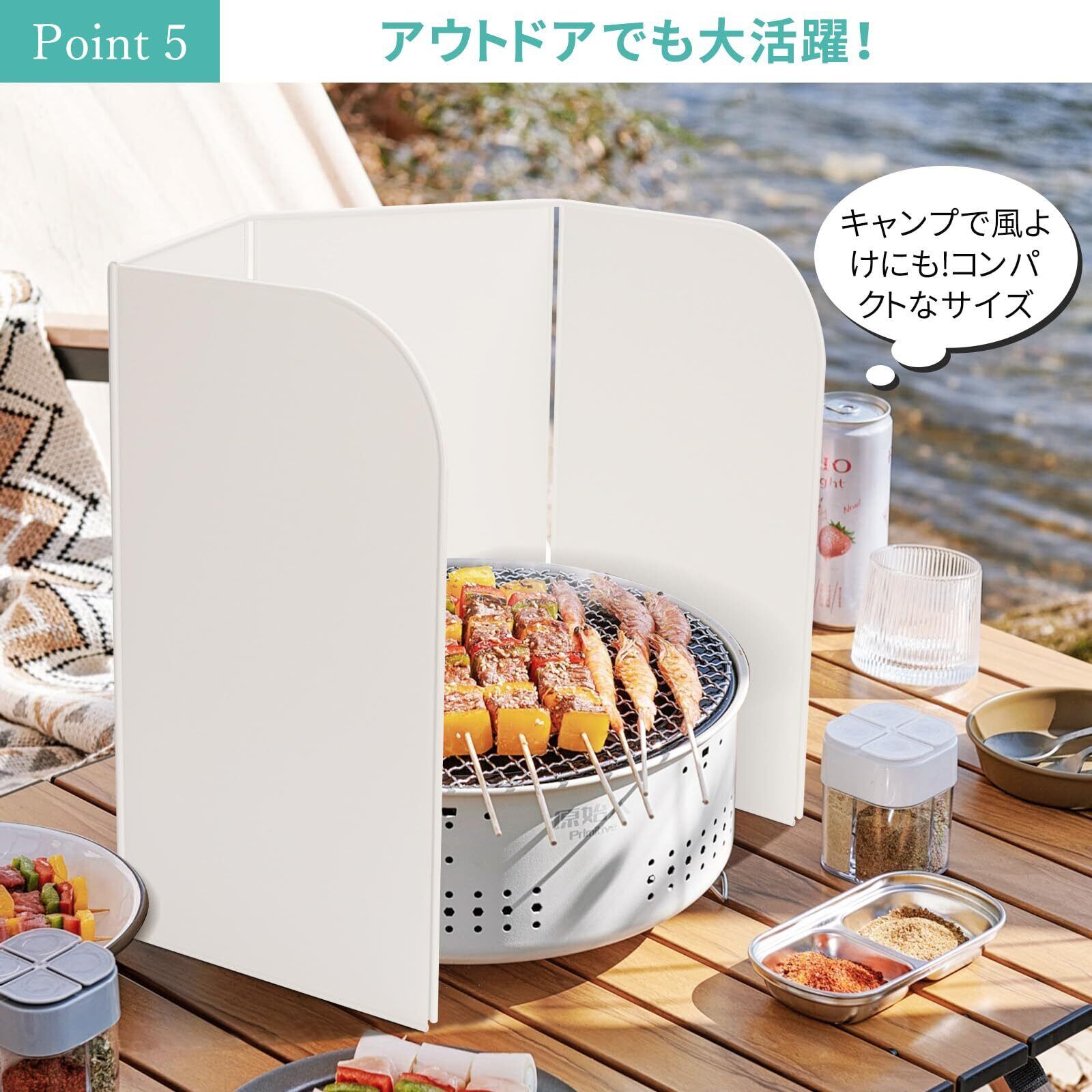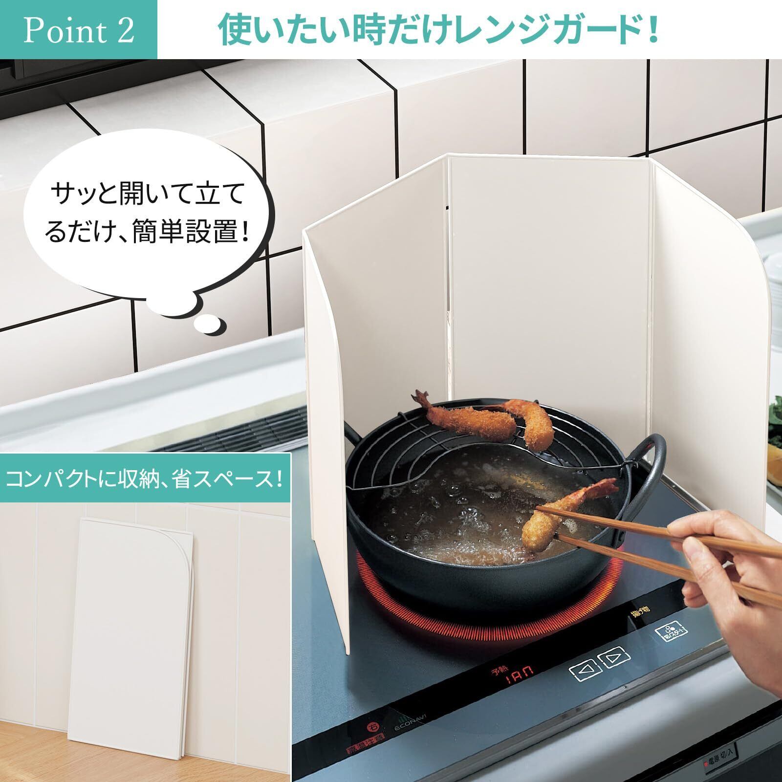 「油ハネを防ぐ4面式」■サイズ /真っ直ぐ広げた時:(約)幅73×奥行0.3×高さ32cm 折りたたんだ時:(約)幅18×奥行1.1×32cm ■材質 /本体:スチール・(表面フッ素樹脂加工) ※商品改良のため、仕様・デザインなどは予告なく変更する場合があります。予めご了承いただきますようお願い申し上げます。