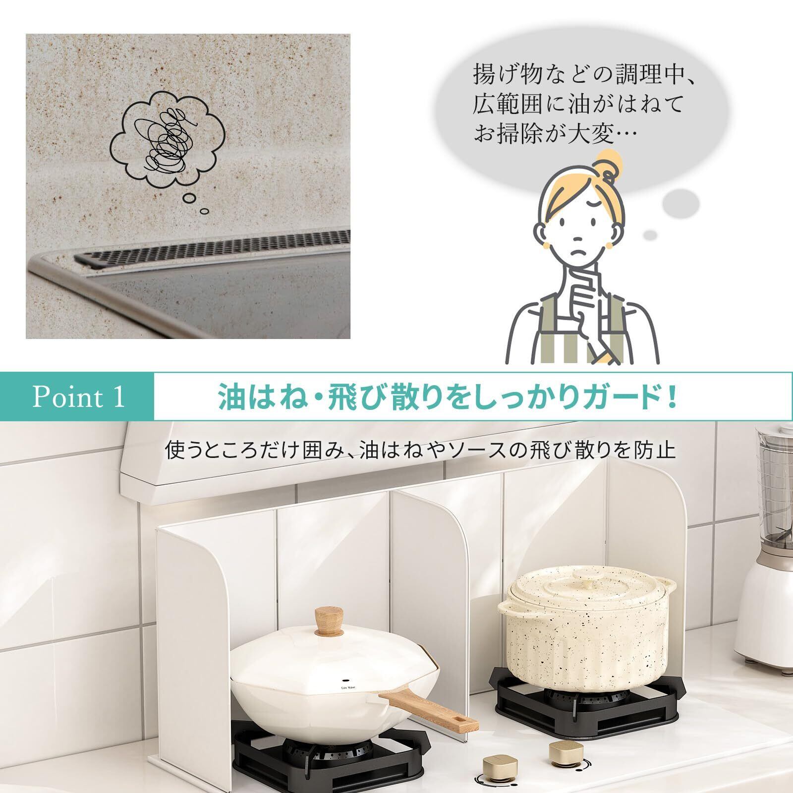 「油はね・飛び散りをしっかりガード」ジャバラに折れる4面式は、調理スペースに合わせて囲み方を自由に変えられる!揚げ物や炒め物などの調理中に、コンロ周りや鍋、フライパン周りに立て、それ以上油が飛び散らないようにしてくれます。キッチンの壁やコンロ周りの油汚れを手軽に予防することもできます。