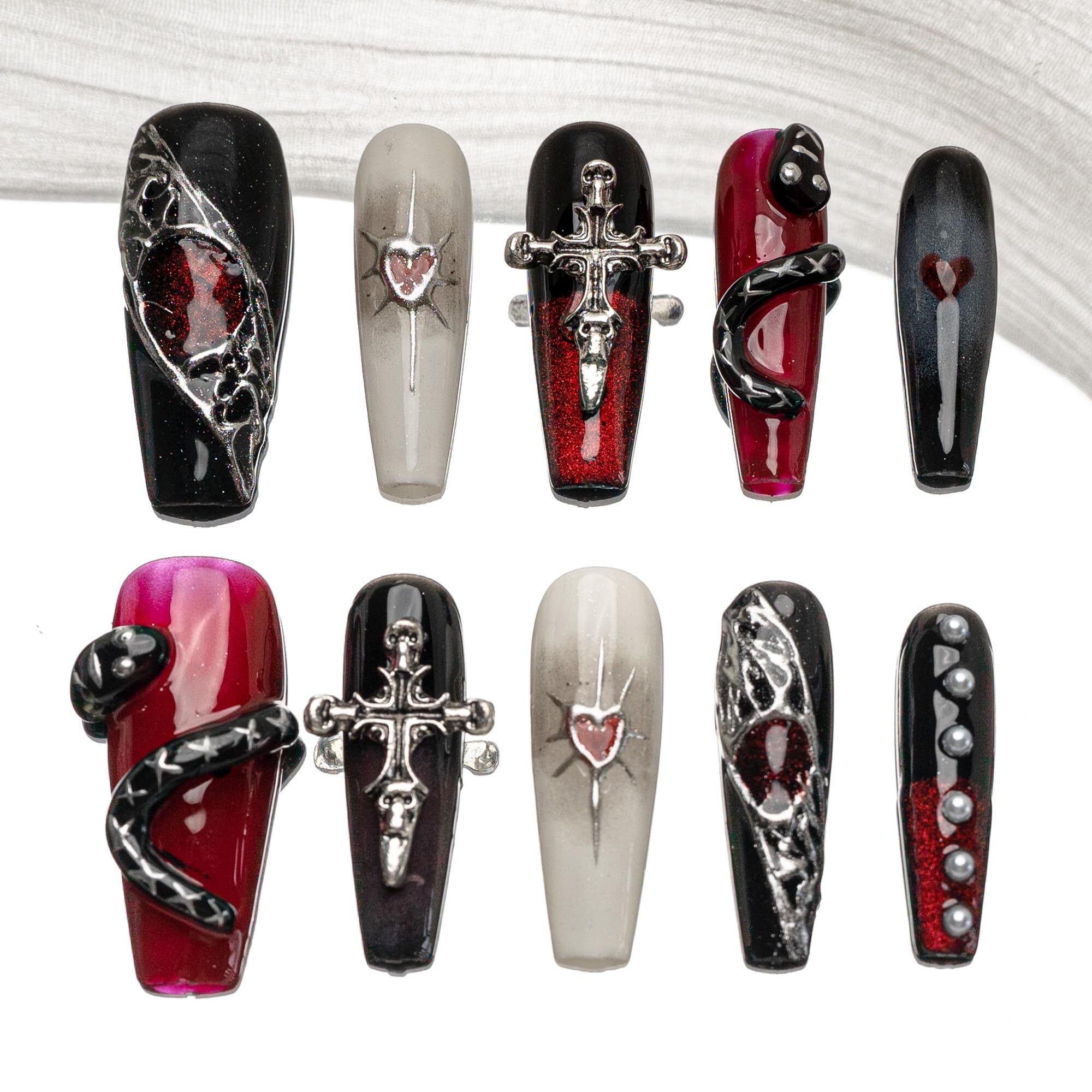 Sun&Beam Nails 手作り ネイルチップ ロング コフィン バレリーナ レッド 赤 ホワイト ブラック つけ爪 ギャル ハロウィン ニュアンス デザイン おしゃれ 付け爪 10枚入 (#189 S)