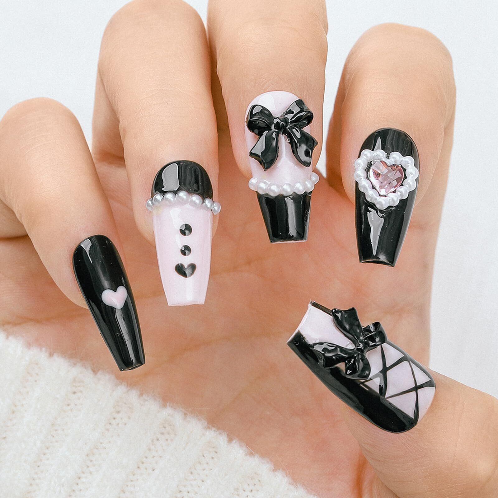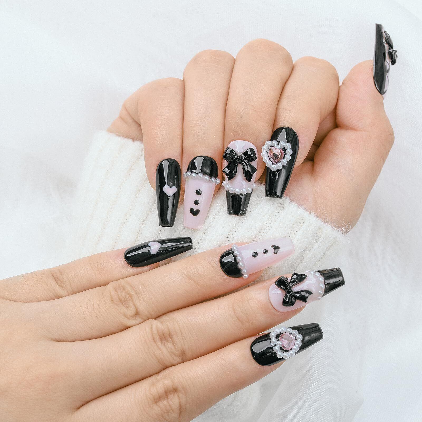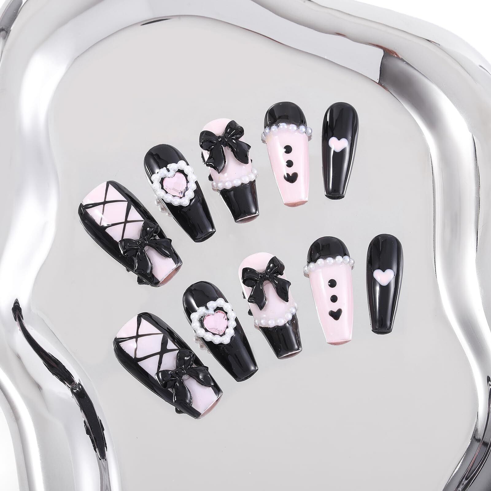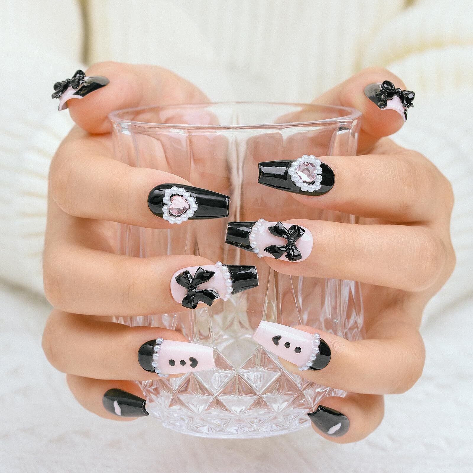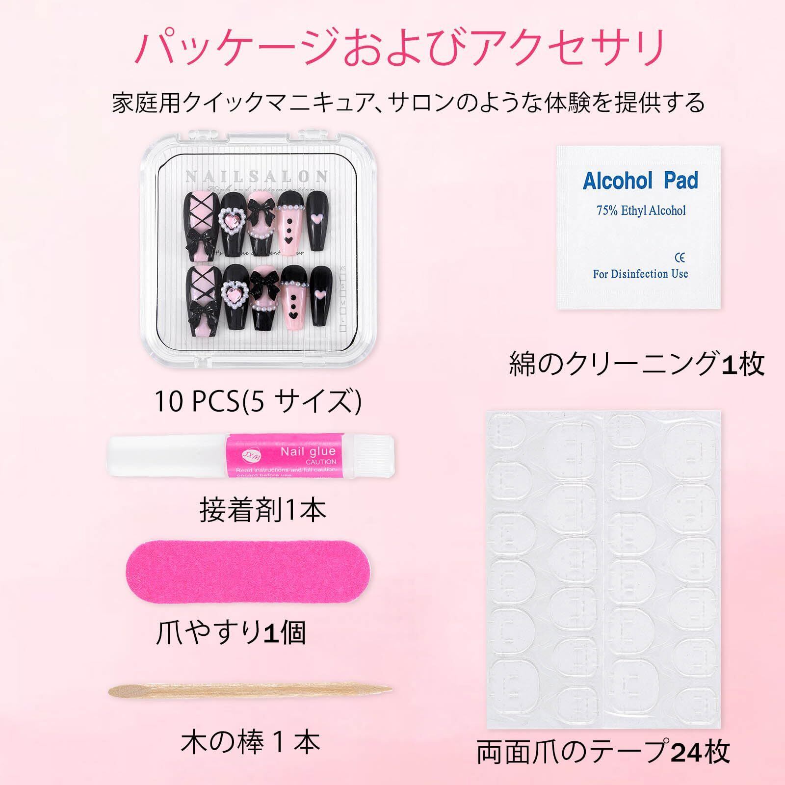 絶妙なデザイン:ブラックとバービーピンクのカラークラッシュデザイン、ピンクのラブハートラインストーンにブラックのリボン、クロスしたバレエフラットストラップデザイン、複数のラブハートパターン、キュートでファッショナブル!装着効果はネイルサロンのようなもので、よりコスト効率が高く、手作りのマニキュアにより、家を出ることなく、少ないお金で一流のネイリストのサービスを体験できます。