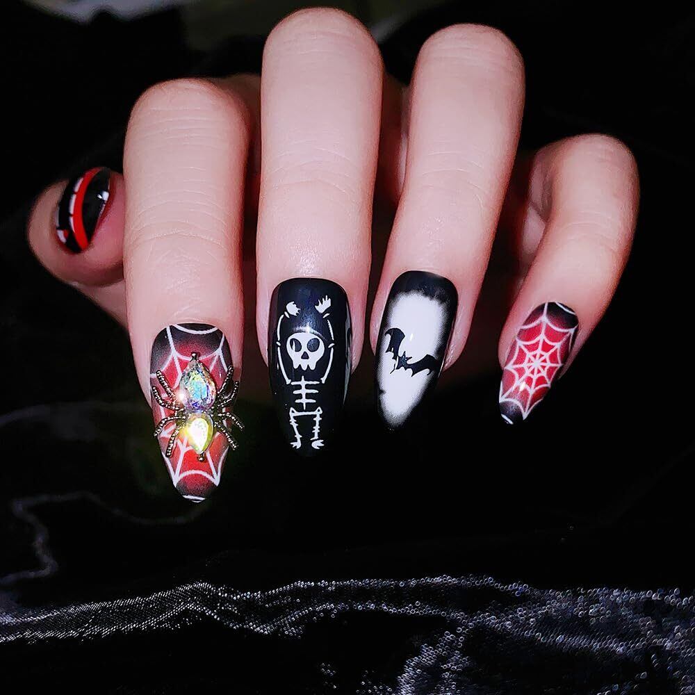 ネイルチップ ショート つけ爪ネイルチップ 短めネイルハロウィンデザイン カボチャ クモ コウモリ 骸骨 DIY ネイル 簡単 ジェルネイル ネイルシール かわいいハロウィン パーティー 撮影小物 目立つ 人気 つけ爪ネイル用品 両面テープ48枚付き (骸骨, 標準)