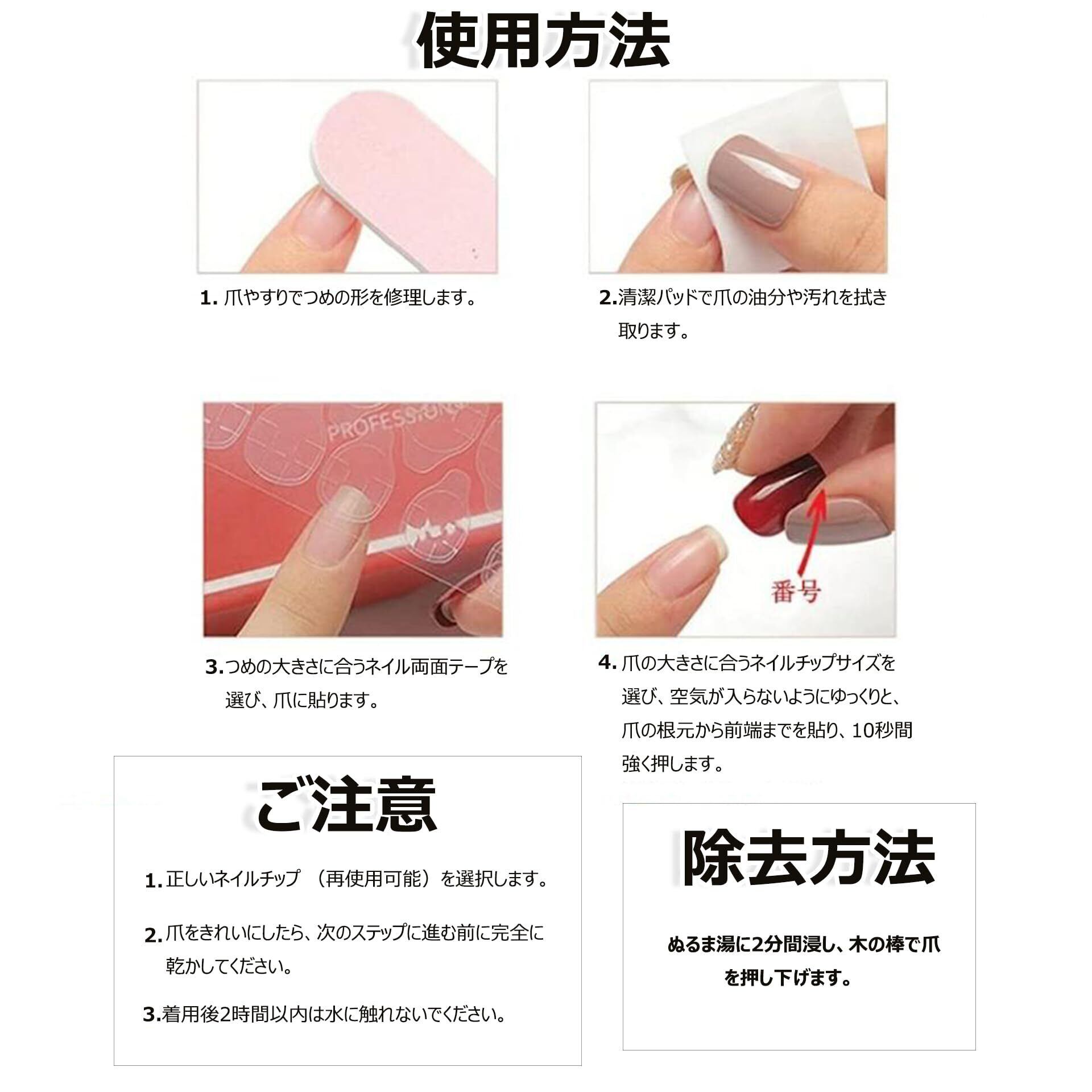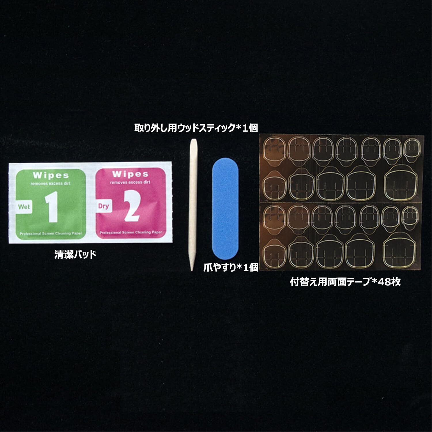 【セット内容】ネイルチップ(24枚入)、両面テープ(48枚入)、ウッドスティック、ネイルファイル。24枚の爪&12種類のサイズがあり、10種類のサイズをお選びいただけます。調整と研磨の後に着ることができます。いつでも楽しめます!