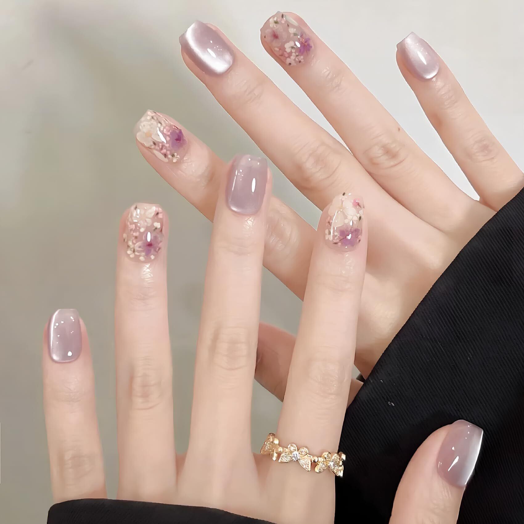 [ALLEVG]ネイルチップ 30枚入マグネットタイプ フェミニンラベンダーキャットアイ プチデイジーモチーフ付き付け爪 春夏 人気 和風 かわいい シンプル おしゃれ 成人式 入学式 卒業式 結婚式 パーティー 花嫁ネイル