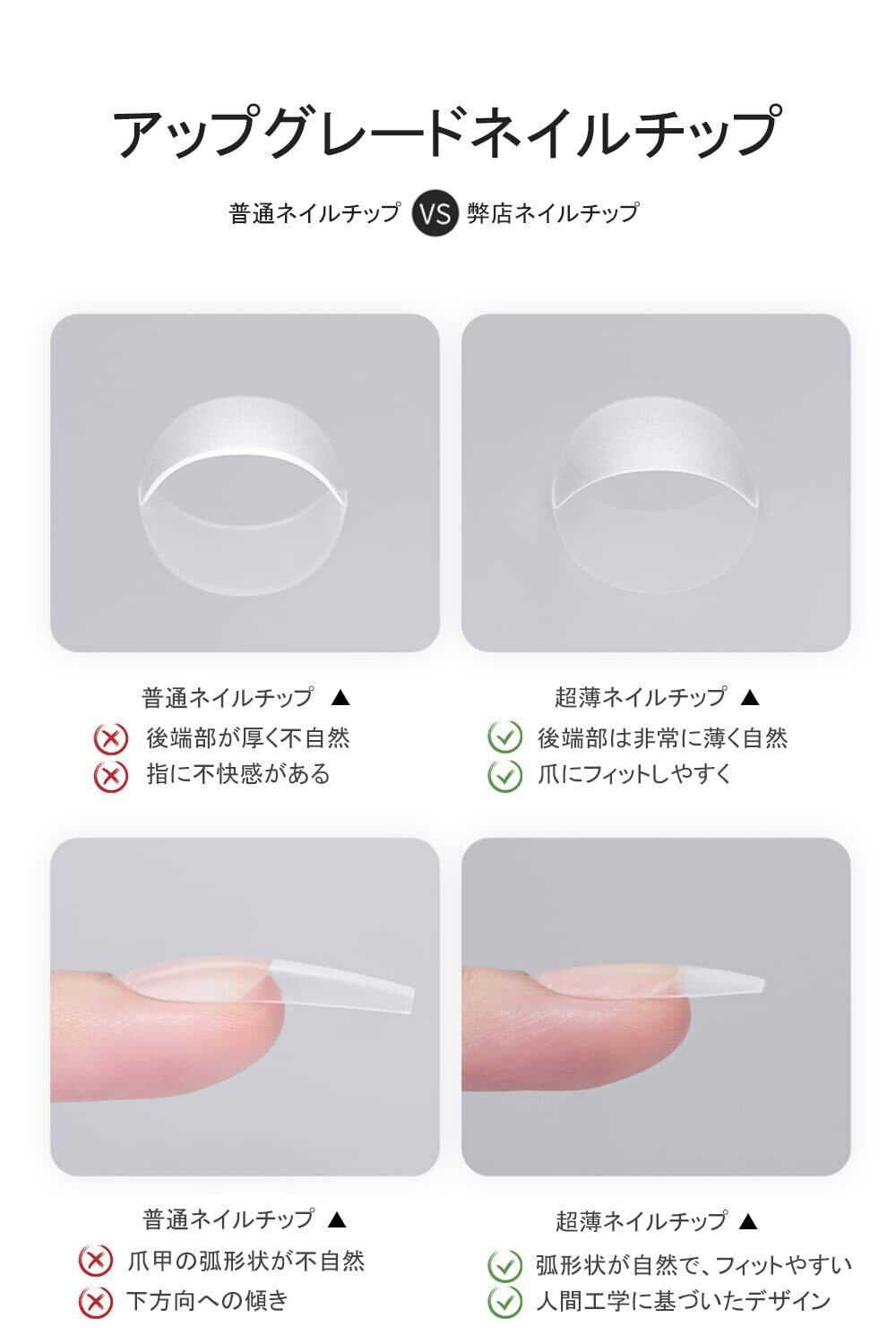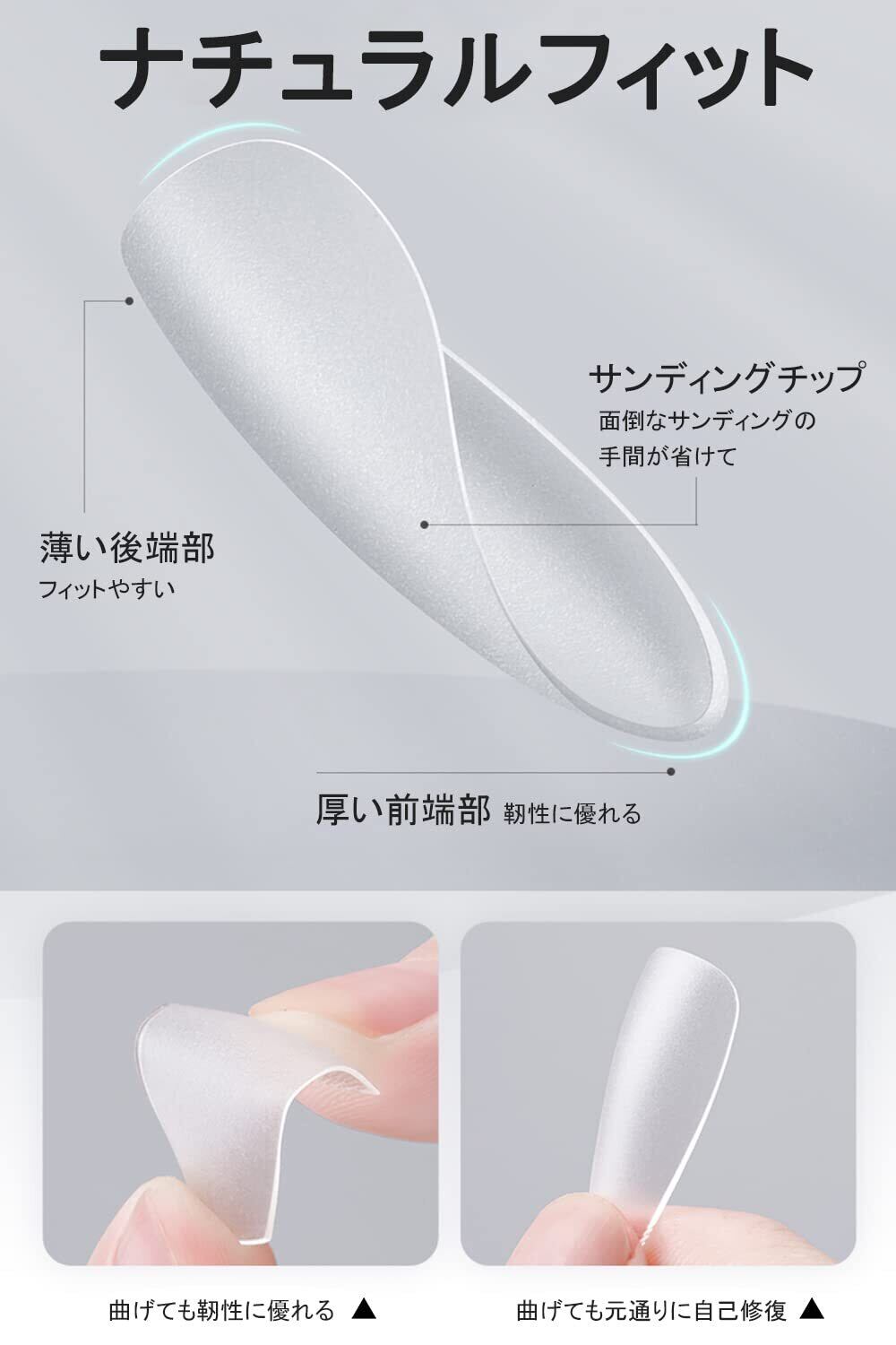 【ナチュラルフィット】このソフトネイルチップは、「薄い後端部、厚い前端部」を特徴としています。薄い後端部はネイルチップ全体が爪にフィットしやすくなり、不快感を感じなくなります。