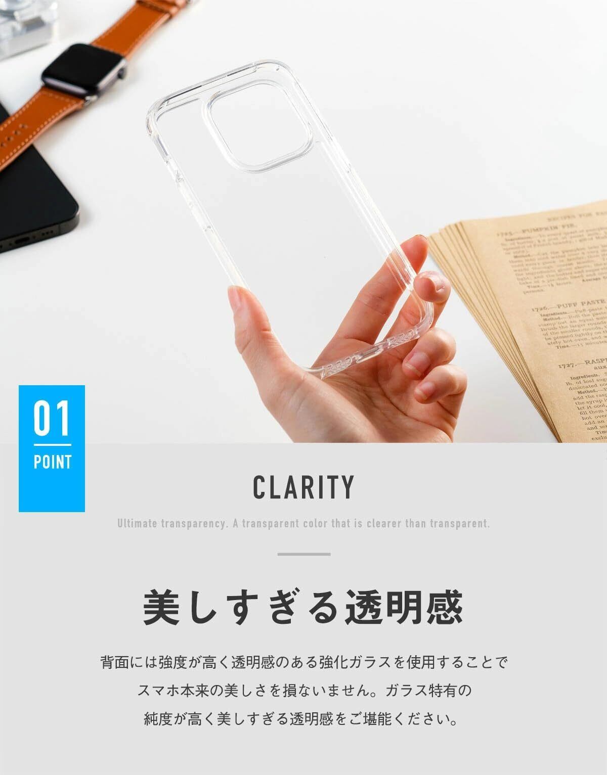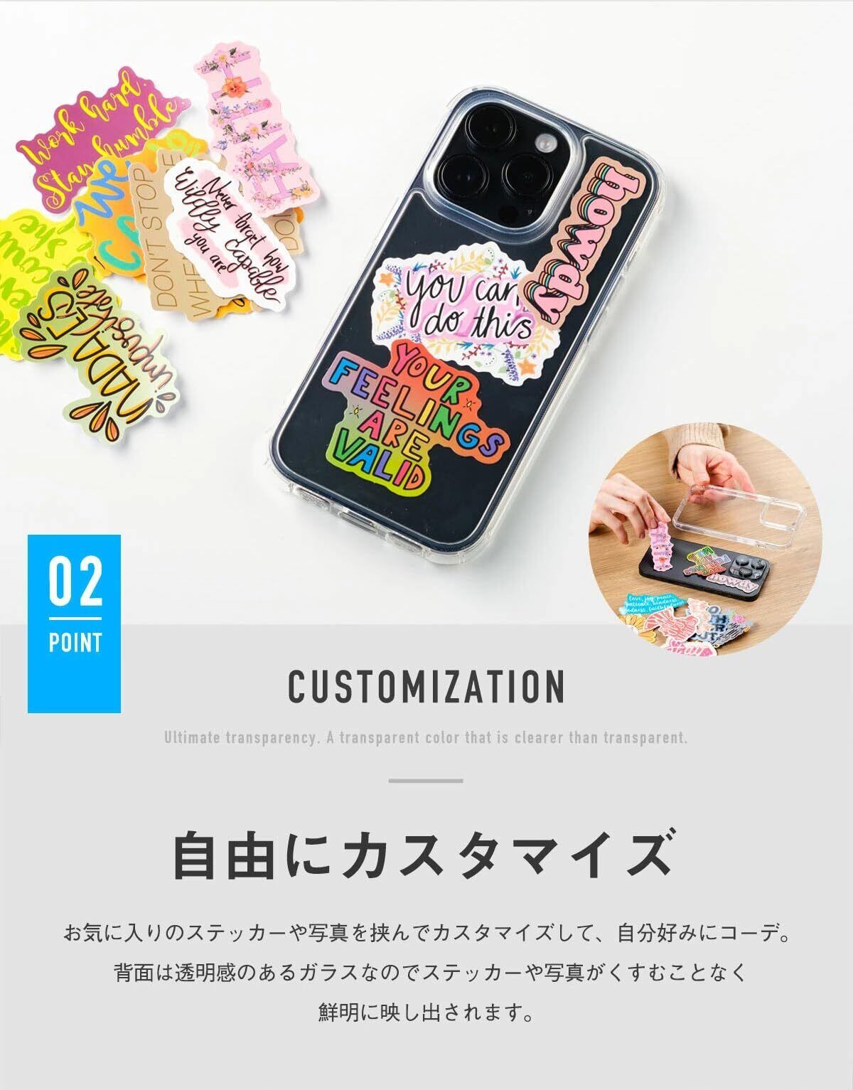 【美しすぎる透明感&自由にアレンジ】背面には硬度9Hを誇るガラス素材を使用。スマホ本来の美しさを損なわず、端末本体を衝撃からガードする設計になっています。 透明度の高いケースだからこそ、お気に入りのステッカーや写真を挟んでアレンジが可能です。ステッカーや写真がくすむことなく、自分好みにコーディネートいただけます。
