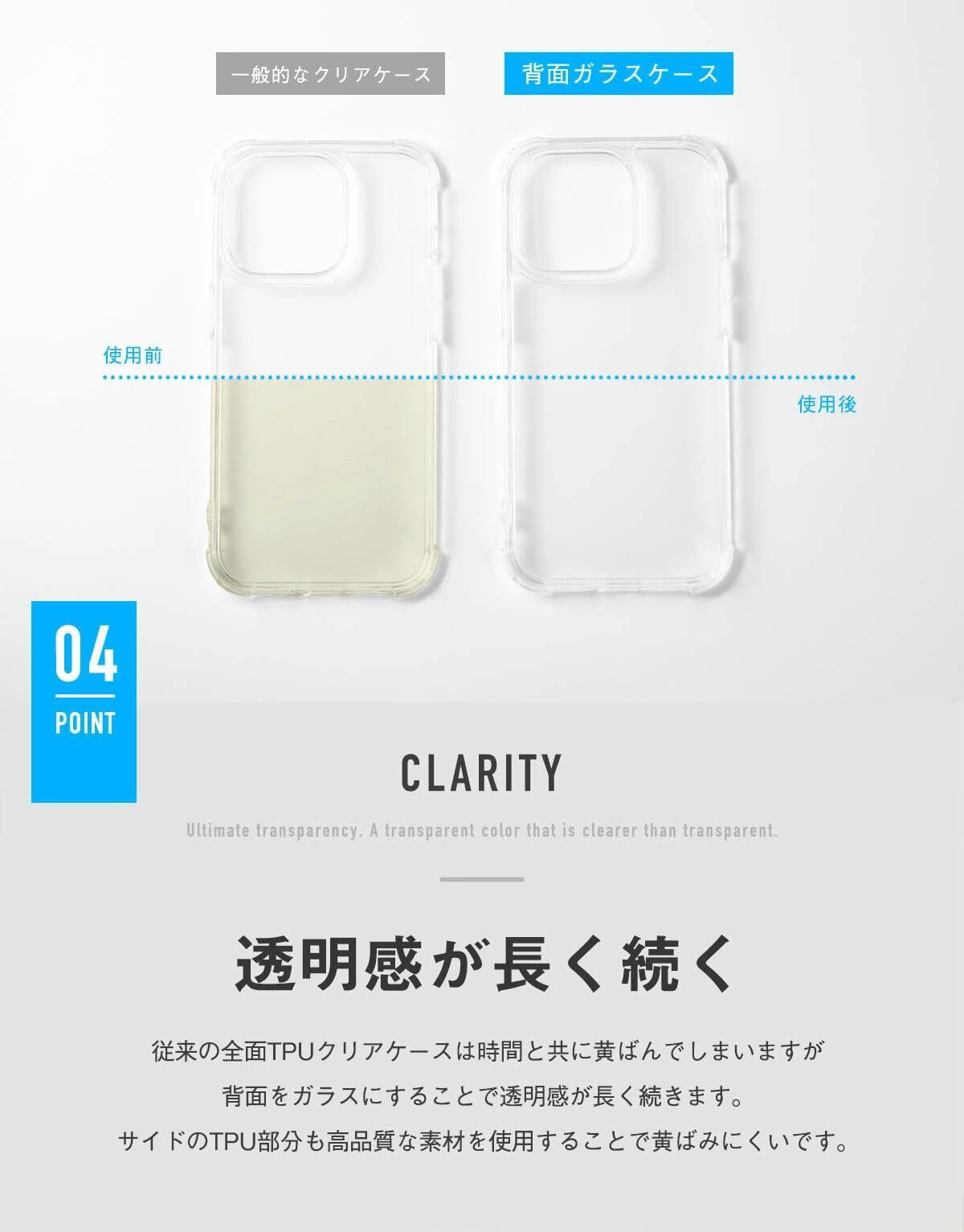 【背面ガラス&側面TPUの最強コンビ】背面には強度が高く透明感のある硬度9H強化ガラス素材を使用し、サイドには柔軟性のあるTPU素材を使用したハイブリッド素材のケース。傷や衝撃からしっかりスマホをガードします。