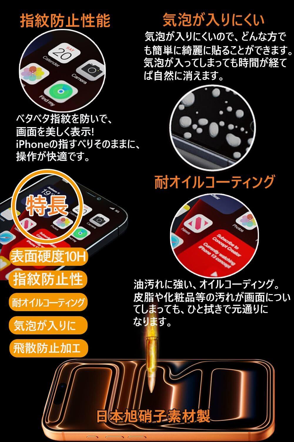【快適なタッチ感!指紋防止·撥水撥油技術】真空蒸着技術を利用し、表面にナノコーティングを採用し、指紋防止薄膜を形成することで、滑らかであると同時にパワフルな耐油汚れ・汗染み・指紋性能を備え、汚れ防止効果はより長く持続でき、頻繁にスマホを拭く悩みがなくなります。