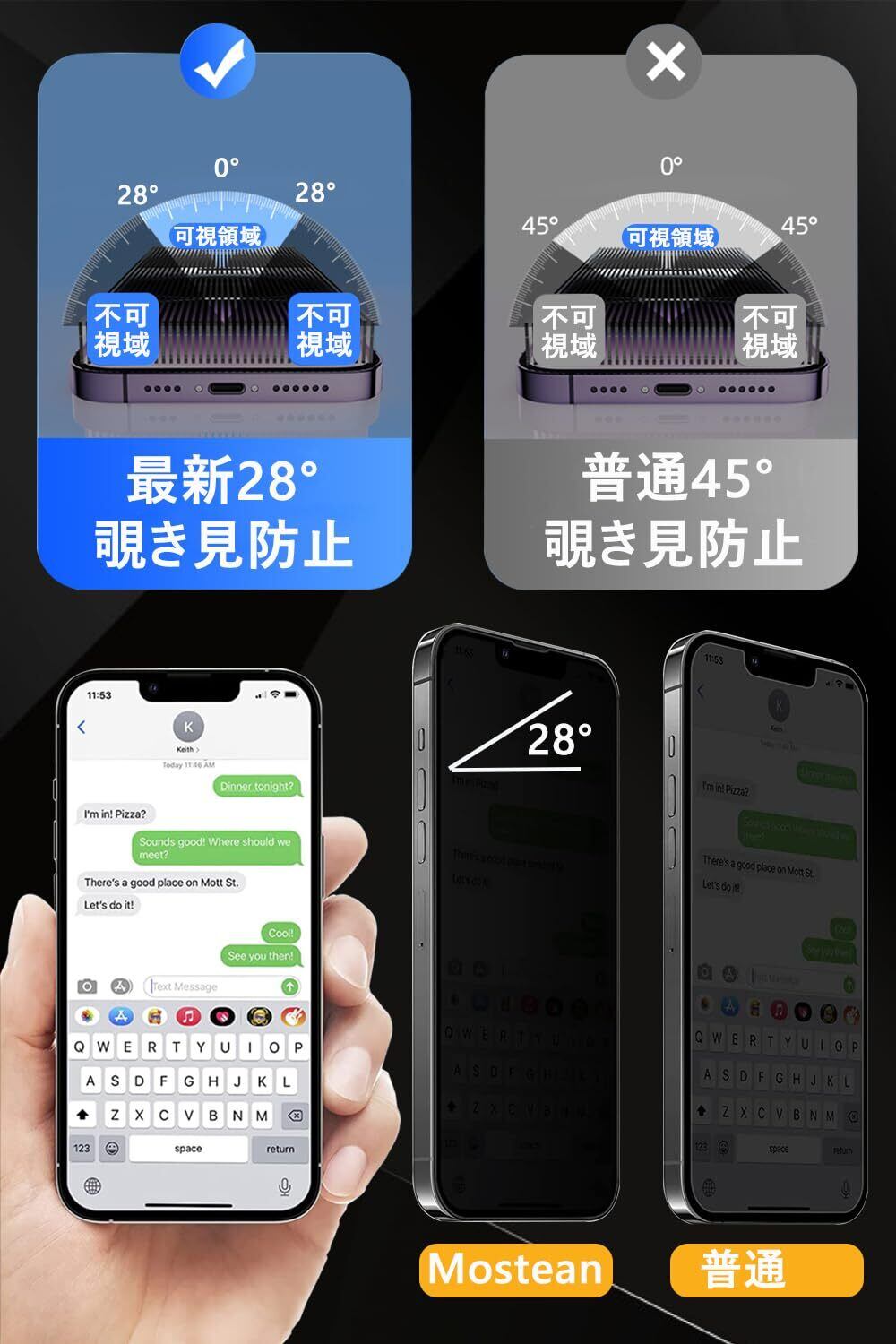 【のぞき見防止】最新鋭の偏光フィルター採用で操作性をキープしながらのぞき見を防止します。正面から見ると高透過率ではっきり見えますが、周りから見ると真っ黒で何も見られなくなり、満員電車やバスの中でもプライベートが守られて、ご安心ください!ご注意:のぞき見防止効果は画面の明るさによって変わります。
